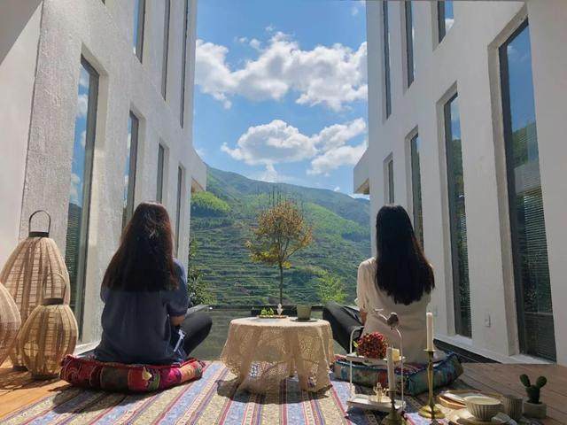 在这里,你可以在阳台上仰望星星仰望月亮,俯瞰满山的土木泥墙瓦盖结构黄泥房,月光下,黄墙黛瓦与层层梯田交相辉映,犹如一幅水墨山水画。