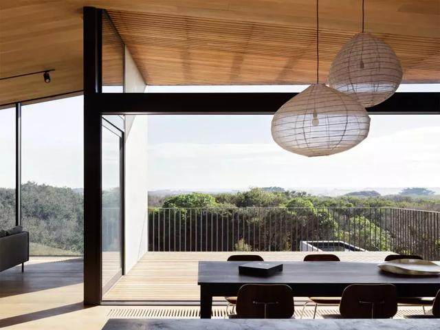 透视上让视野更加宽阔。而深色的横梁和框架构成画框,通过巨大窗户看到的