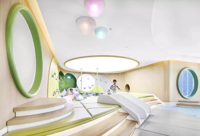 多层视觉透过不同形状、符号、线条、弧度创造草地、树林、岩石、隧道等各种素材让小孩感受不同触感,滑梯下的球池、走廊上的跑道、餐廳中的鞦韆、玻璃屋的烹饪室,不断探索、学习、暸解世界。