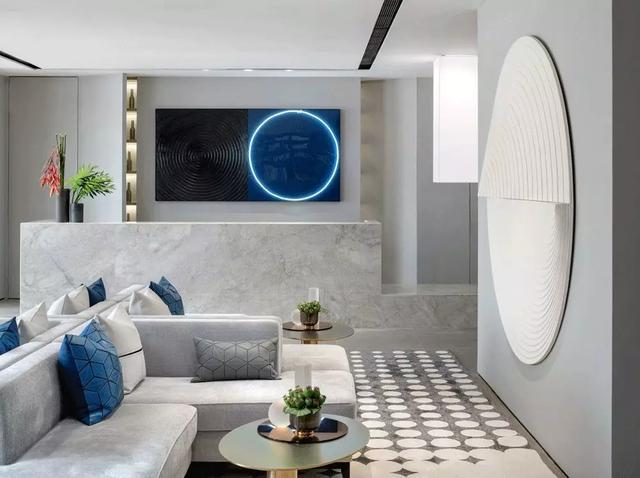 关乎人们生活的艺术便是設計本身,VIP区中的蓝灰色的艺术品活跃了空间的气氛,将交织的现象抽象化,隐喻自然法则和人类在宇宙中的作用。