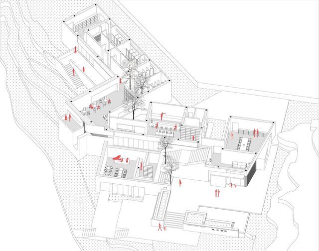 服务中心設計的出发点是用建築形体来强化自然地形的变化,并在风景和建築之间寻找平衡。建築形体和布局依据地形的起伏和高差变化而自由展开,对场地特征的尊重本身就是一种抽象的“拟态”。箱型的几何形体被设置在不同高差的平台上,但应功能的要求,又被联接为一个连续变化的整体,如同山间的几块巨石,“随意”地搁置在场地上,自然而又多变。