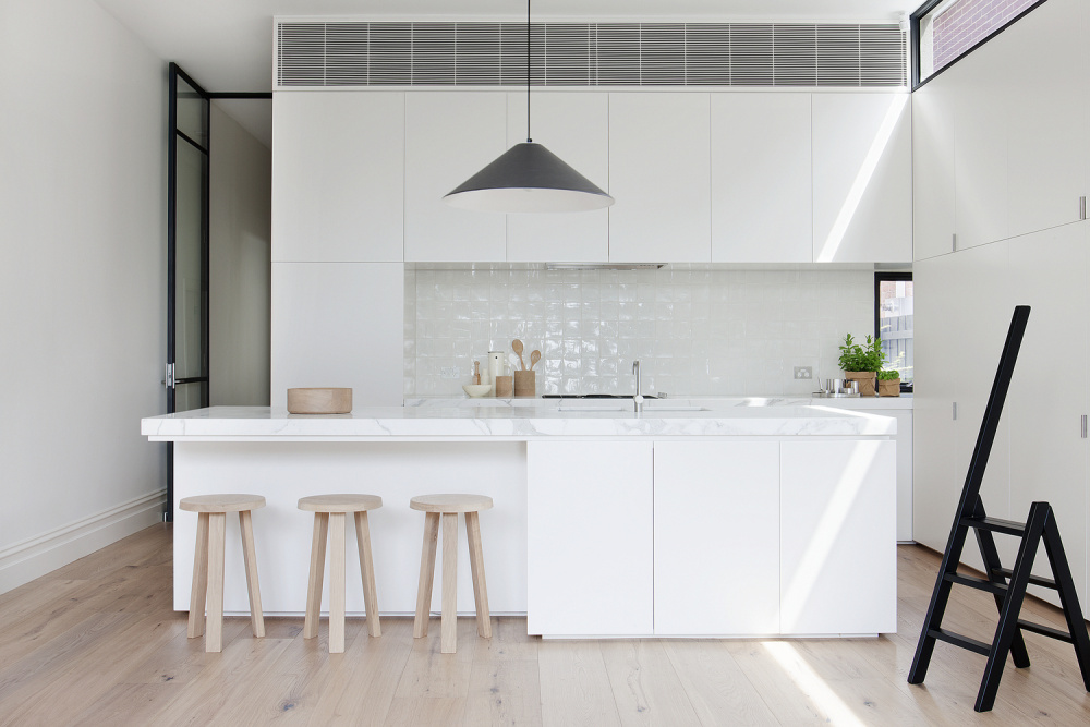 Robinson Rak Architects and Made by Cohen transformed this dark Victorian home in Melbourne, Australia, into an open, light-filled living space. A fully glazed exterior wall connects the kitchen with the adjoining courtyard and clerestory windows further illuminate the large living area.