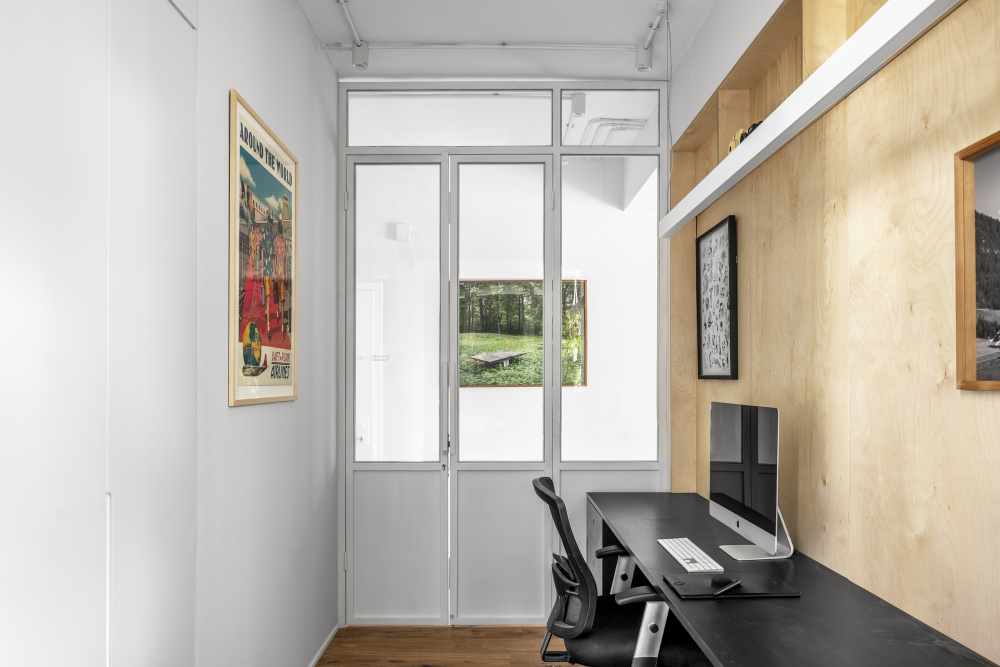 - The architectural concept, similar to other RUST Architects' projects, is to create comfortable living spaces even in small Tel Aviv apartments and to extend specific spaces in the home and combine functions to create maximum space and comfort.The entrance has a relatively wide foyer, which serves as the main junction of the apartment and thus creates a sense of space. Opposite the entrance is a workroom with a metal framework partition, which lets light pass into the hallway and the internal foyer.