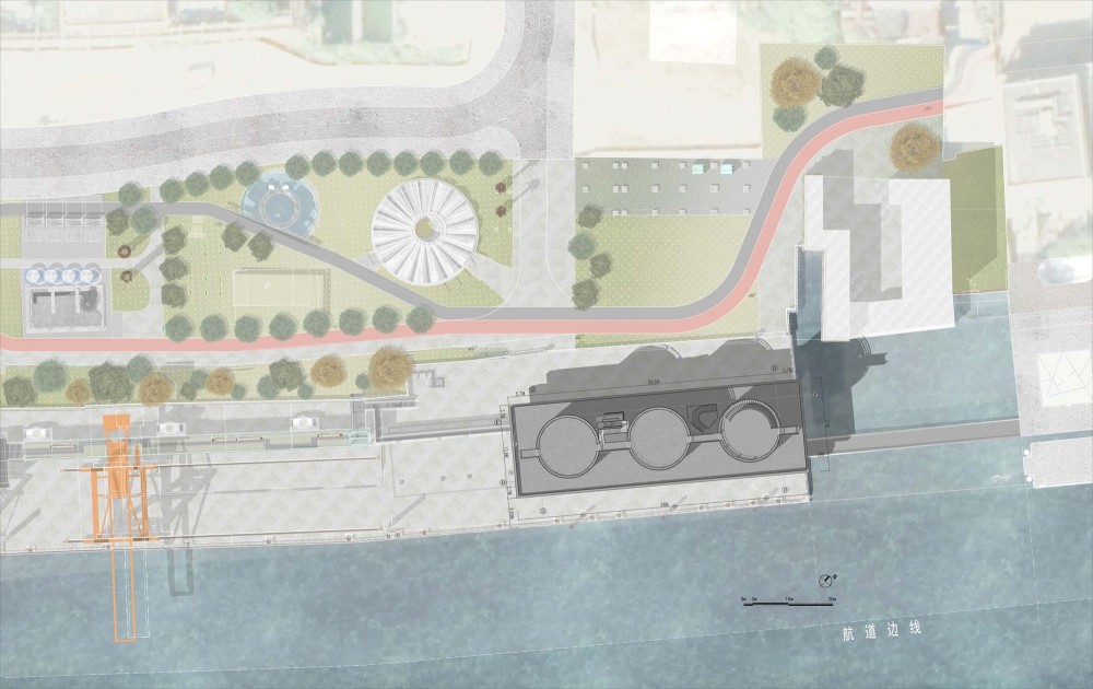 - 设计师描述 | Designer description: Currently at No.2800 Yang Shupu Road is Yang Shupu Power Plant, the once biggest thermal power plant in the Far East, which was built by the British investors in 1913. The site is left over with 105-meter-high chimney, huge crane-mouth hanging along the riverside, trestle works that used to carry the coal, clean water pond, damp and dry ash tanks and etc., which boasts spectacular space and impressive form and occupies a crucial position in the public project of Yangpu Waterfront.