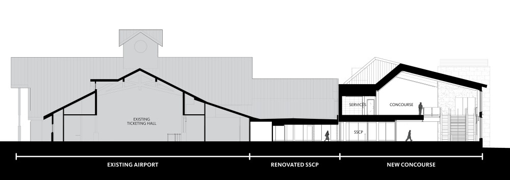 - 设计形式:该设计的启发来自于山谷中农业和畜牧业历史的启发,简单的建筑彷佛像当地常见的谷仓的一样,点缀在其中。从背景上看,屋顶形式补充了现有机场航站楼的体量和规模。这样的形式在不影响航站楼的内部正常运转的同时,提供了一个可以俯视整个飞机场并能够瞭望远处群山的视野。