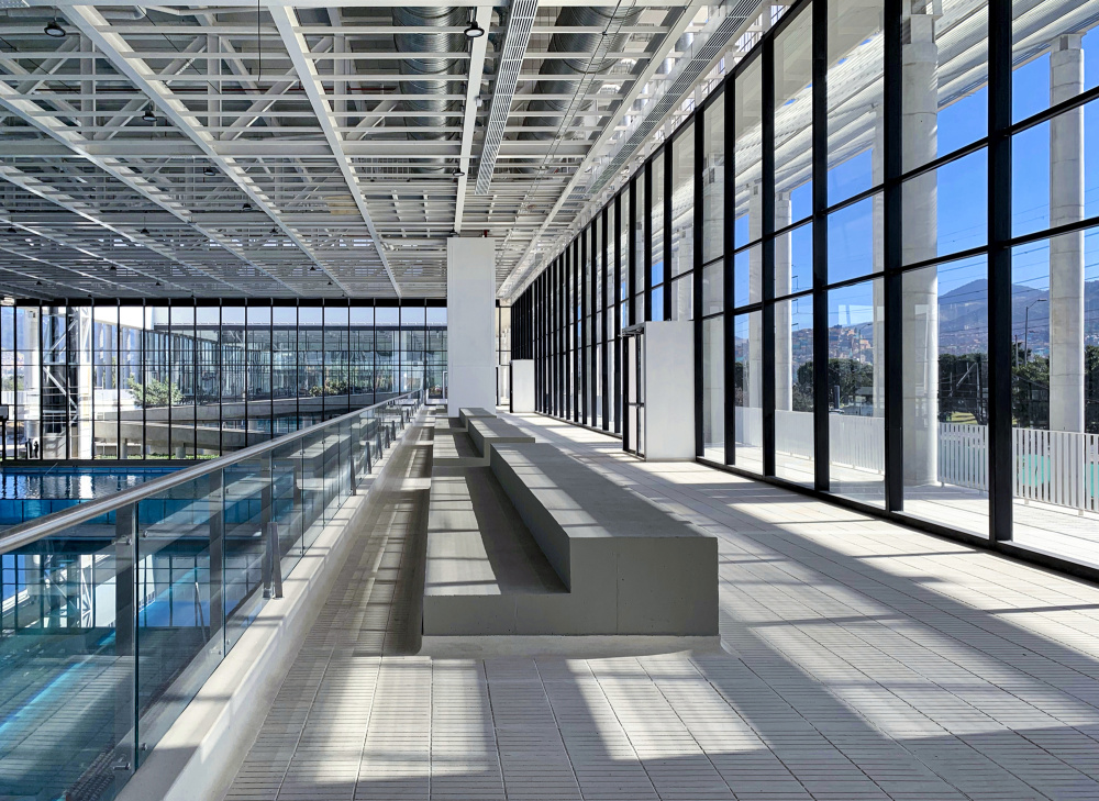 From the programmatic point of view, the building is composed of three large areas, the water recreation area, composed of an Olympic swimming pool and a recreational pool, the sports area containing a gymnasium and a sports centre, and the cultural area with classrooms, playrooms and a cinema that can be opened to the outside for open-air screenings. These three areas are articulated by two courtyards, one for cultural events and the other for recreational activities, which give direct access to the park and enable the control of secondary access to the different spaces of the project, allowing independent operation and opening at different times of the three areas of the project.