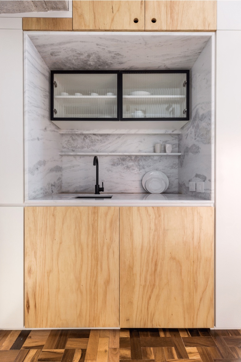 - 设计师描述 | Designer description:Este departamento de 30 m², con paredes en ángulo y una planta irregular, alguna vez fue una habitación de hotel. En el centro histórico de Porto Alegre, el Hotel Lido ha sido durante años una referencia en la búsqueda de alojamiento en la capital del estado más austral de Brasil, cerca de la Plaza Matriz y el Mercado Público. Sin embargo, la nueva demanda de departamentos pequeños ha convertido a este hotel en un edificio en común.