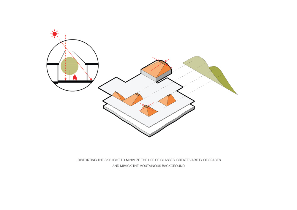 - De acordo com o requisito do proprietário, que era o grande número de áreas utilizáveis em um volume térreo, as claraboias de dispersão foram escolhidas como um recurso. As claraboias não só resolvem o problema iluminação, mas também evitam os incômodos causados pela chuva como transtornos na usabilidade e dificuldade na manutenção. Essas claraboias são projetadas para ter características especiais e únicas.
