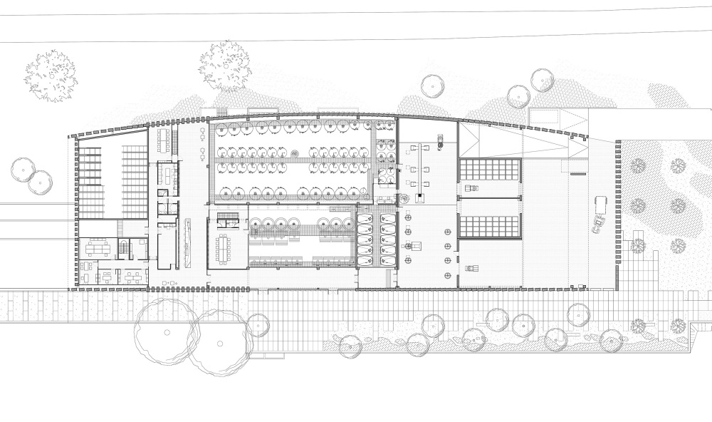 - The building is partially sunk into the hill, a thermally inert emergence optimised for winemaking. The slope allows for a natural gravitational flow and a coherent linear process, visible from the public esplanade and reception areas overlooking the cask-room and steel tank hall.