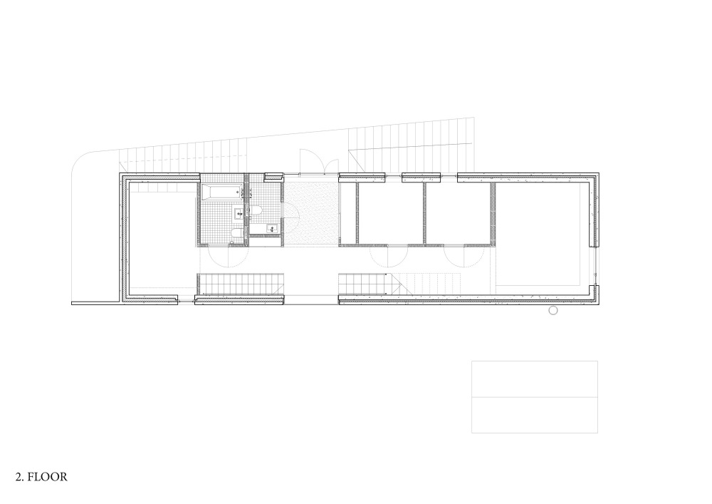 • 进出后花园的厨房入口处理成内凹的空间,亦可遮风避雨。雨水被引至屋侧的一处独立水景。厨房上方的木夹层提供了一个安静的学习角落。不可开启的窗扇都直接密封在混凝土里。矩形大窗提供可坐的混凝土宽窗台。三间卧室和一个休息厅在二层,客卫公卫各一。主入口也在该层,通过室外花园踏步可达。这层所有混凝土楼面都经细磨抛光处理。