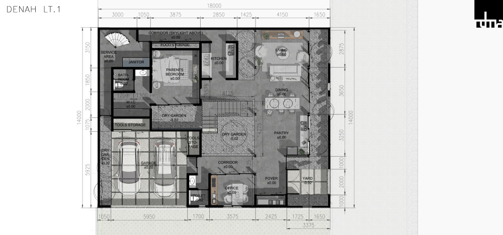 - 房屋的边围由双层墙界定。具有较大开口的混凝土表皮墙作为主要围墙和隔断以保护隐私,同时保持其视觉效果尽可能开放通透。而在内部,墙后的空间灵动活泼。墙的偏移线形成的间隙用作缓冲区,并通过放置一些植被来在视觉上软化“堡垒般的感觉”。