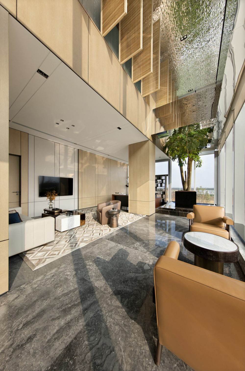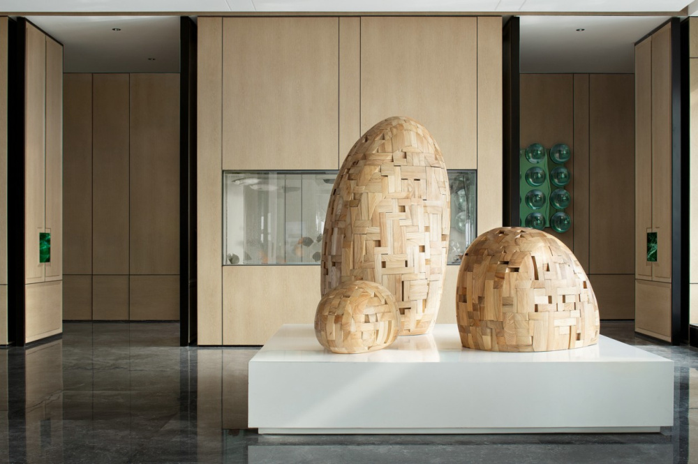 延续整体的木质美感,在布局上点缀出人文气质与涵养,从而弱化建筑的理性本质。凹凸造型通过竹编的表达手法,增添编织感与层次感,空间因而愈加丰富。