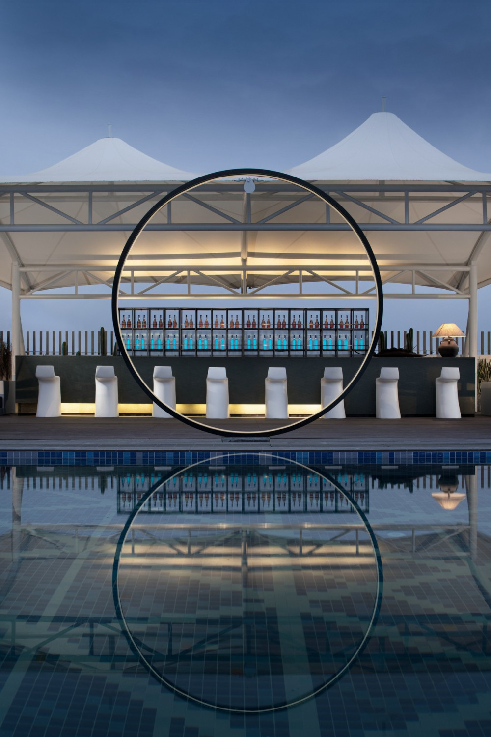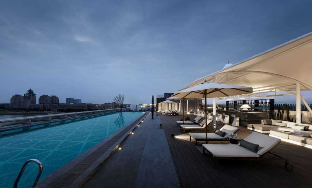 顶层承载着视觉感官的极致体验,既是天然的舒适休闲区,也是完美的社交场,自然与氛围恰到好处。暮色中的水吧台,在明暗的光里,时尚华丽。露天泳池,又颇有一番滨海沙滩之感。