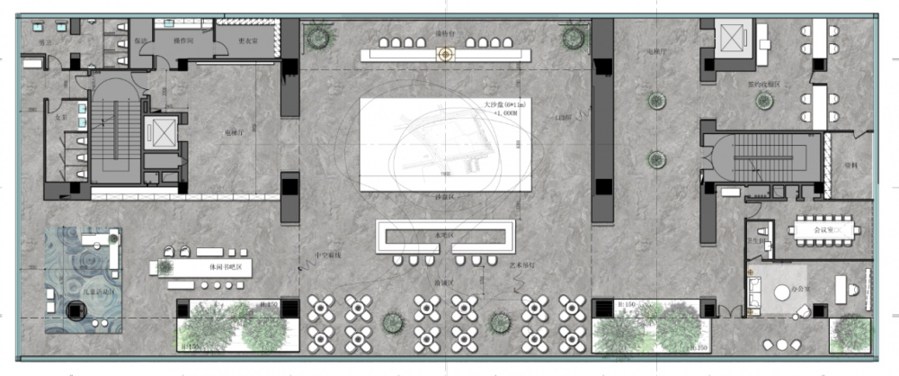 沙盘区天花布置为繁密的网状结构,悬空的线条像浮游的神龙,在视觉层次上弱化单一性,转接为更具艺术化的表达。