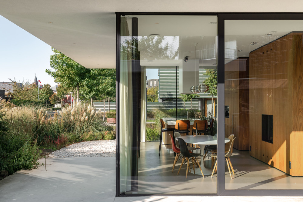 • 白色的天篷在别墅的后部进一步延伸,与周围露台的占地面积相匹配,并与结构玻璃幕墙一起,形成了一个中间区域,使客厅,露台和花园在空间上可以相互渗透。 花园伸入悬挑下方的露台,使定义它们的边缘变软,从而增强了效果。