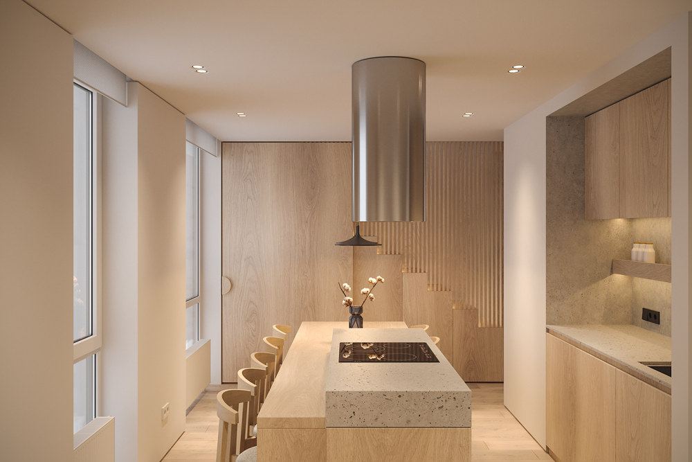 Serenity ApartmentThe key element of any interior is a smart and comfortable functional zoning. After getting acquainted with the family, our design team took into account all their preferences and then proceeded to the development of the interior of a two-storey apartment, following the basic rule of the interior design. As a result, the 120 square meters apartment for a young family of four became a representation of their preferences, ergonomics rules and comfort as well.The large amount of wood and concrete, combined with the calm pallet of colors in the decoration and furnishings, create the cozy atmosphere. Also, each room has its own specifics, which gives the rooms their own characteristics and represents their basic architectural functions.1st Floor