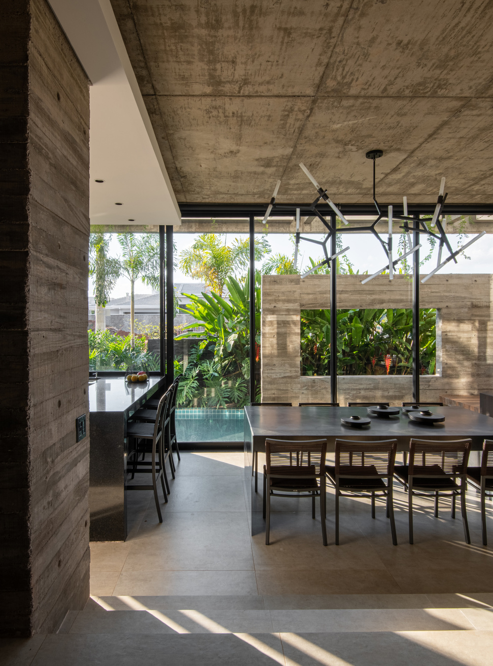 - Quanto a sua arquitetura, a todo momento do processo de criação e concepção do projeto, sempre tivemos a atenção de desenvolve-lo considerando cada questionamento e vontade dos proprietários. Seu partido arquitetônico, tem seu pé na discussão do brutalismo e tange uma breve discussão no minimalismo, isso, considerando pela pontualidade das peças, funções e materialidade. Mas em suma, vejo a casa deter uma identidade própria, sem assumir um estilo pontualmente. Seu corpo principal é composto por concreto armado, este por sua vez, moldado in loco, onde cumpre seu papel sensorial e visual da casa, estabelecendo nuances de tonalidade em sua superfície de modo orgânico, a presença constante nos ambientes potencializam a amplitude sensorial dos espaços e além de nos prender sutilmente a atenção na composição e correlação dos elementos construtivos.