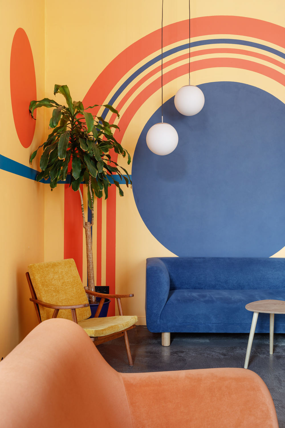 “Orbita 67”是第 67 条平行线——咖啡馆创始人的家乡,因此对于内部图形基础,我们采用了穿过整个内部并将其统一的平行线和圆圈。 家具大多是复古的,我们和咖啡店的创始人一起在跳蚤市场寻找并修复了这些家具。 “Orbita 67”不仅仅是一家咖啡馆,而是某种社交俱乐部。 房子的居民可以在这里举行会议,讨论重要事件并收集签名。 晚上,邻居们聚在一起玩棋盘游戏或在投影仪上观看视频,这里随时欢迎携带宠物的客人。