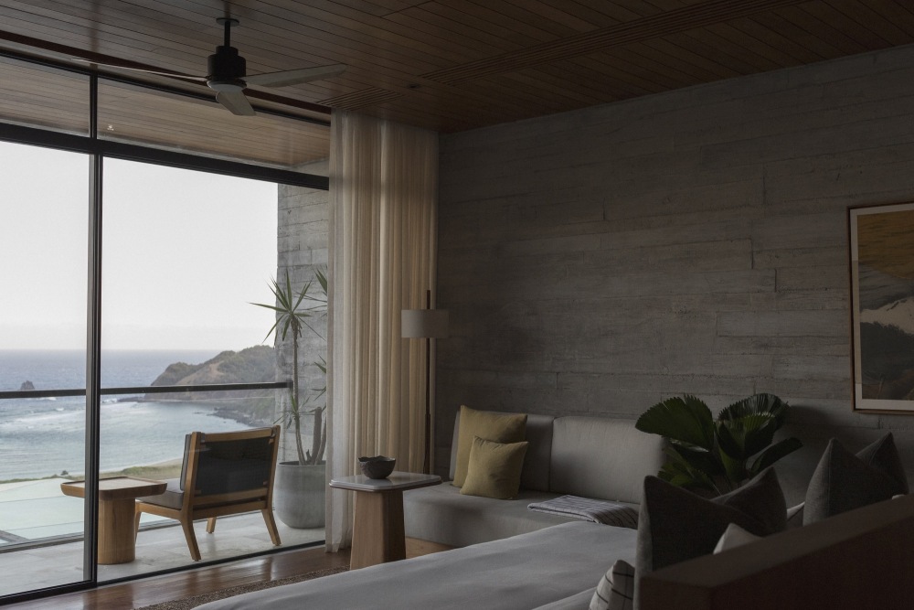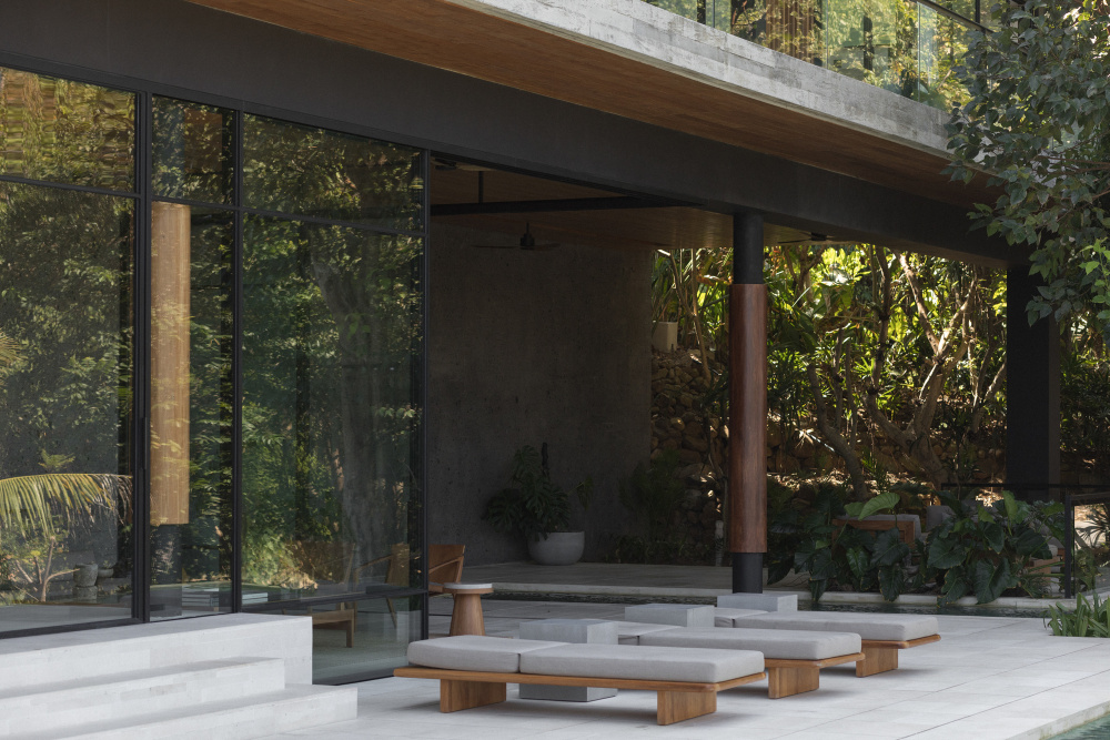 所使用的材料将板成型和光滑的混凝土与当地的石头和柚木板结合在一起,根据位置的不同,这些石头和柚木板在地板、墙壁和天花板上有不同的用途。植物选择是因为它们的需水量低,其中许多是该地区的本土植物。室内采用当地面料和定制家具。