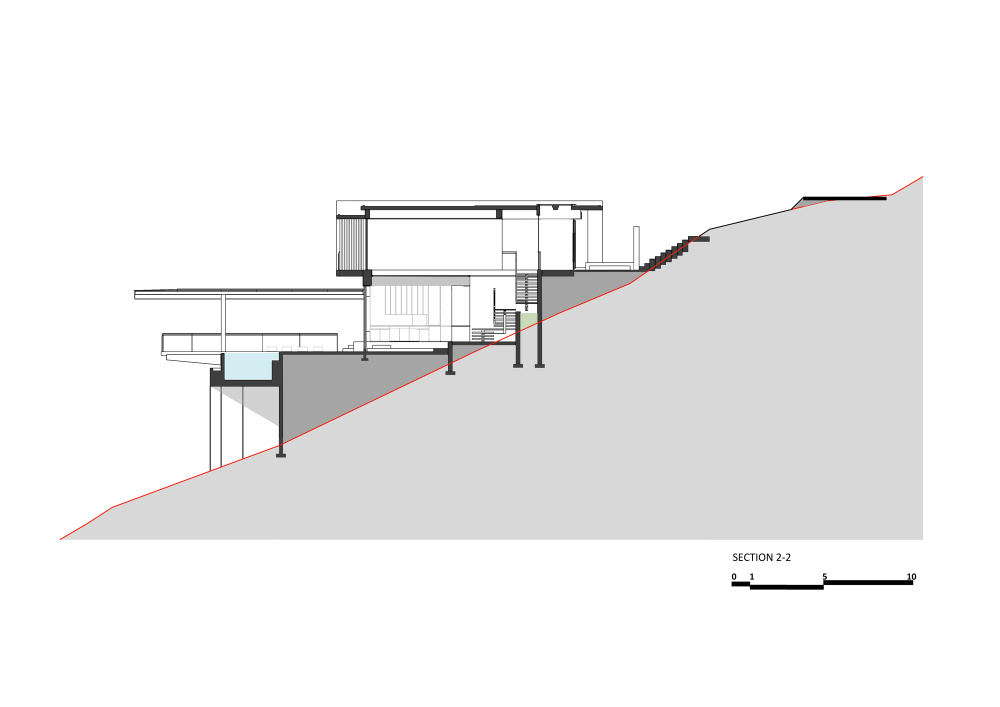 房子坐落在陡峭的斜坡上,可以看到远处的海湾。房子利用场地的坡度从顶部进入,然后下降到房子的生活空间。这座房子是通过密集的景观进入的,看起来是一座单层、低容量的房子。深深的悬挑提供了有盖的停车场,并为房子遮挡了强烈的北方阳光。
