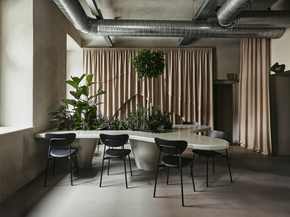 中央公共桌的设计看起来像是从地板上出现的自然现象,装饰着植物,由四张桌子组成,每张桌子可坐三个人,尽管每个座位都有个性,但都能营造出一种社区和团结的感觉。