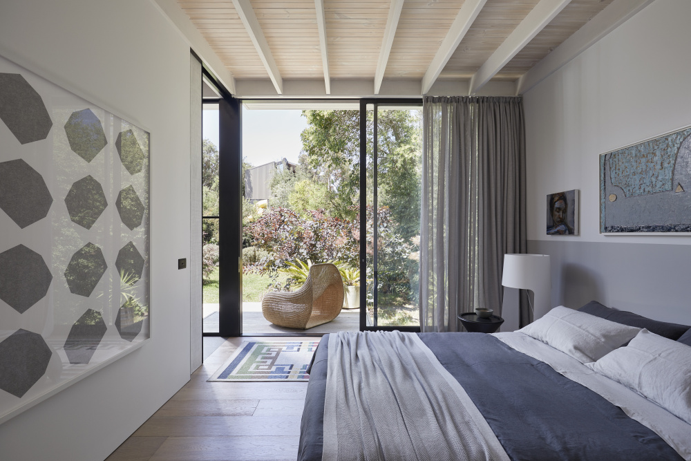 开放式起居区配有完全可伸缩的滑动玻璃板,可以无缝过渡到室外木甲板,与花园形成牢固的连接。这种灵活性还允许在夏天跟随阳光、阴凉和舒适的微风。