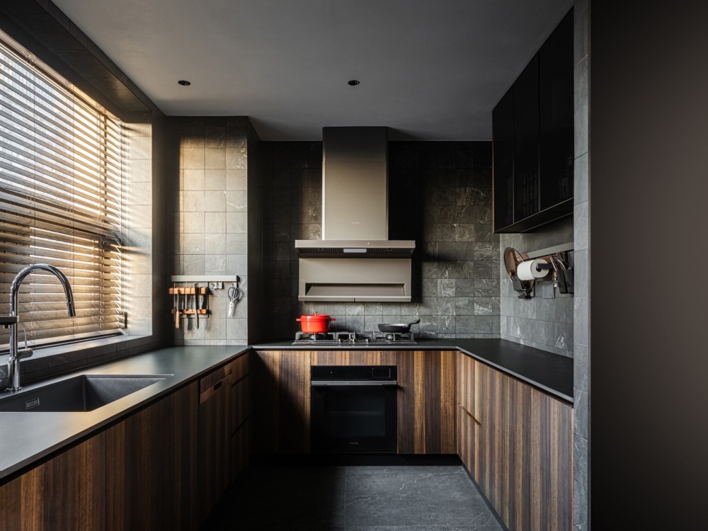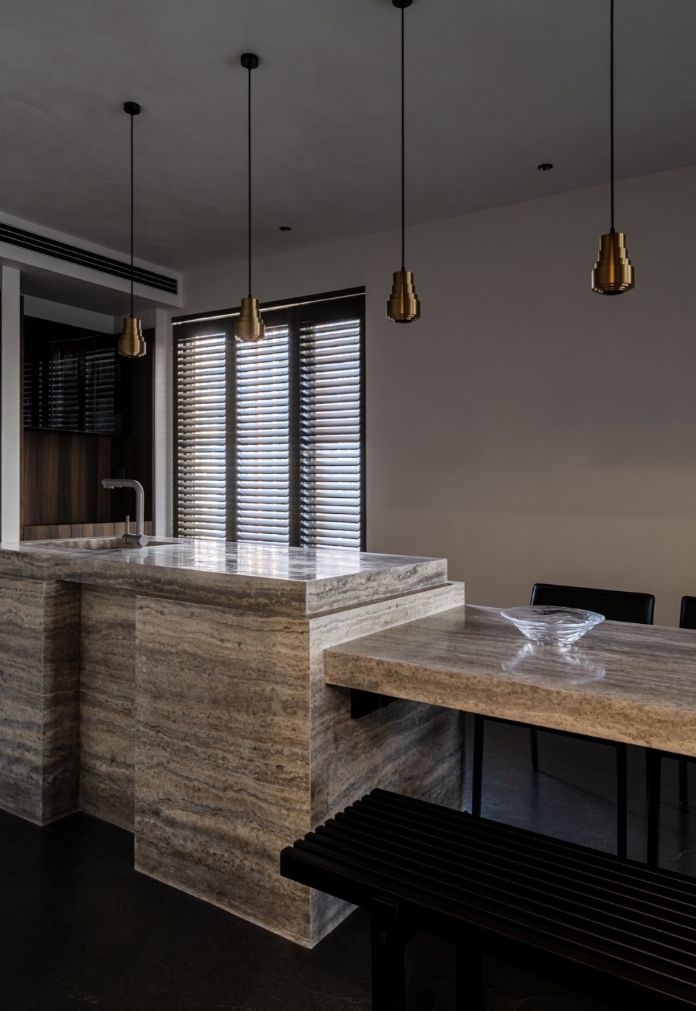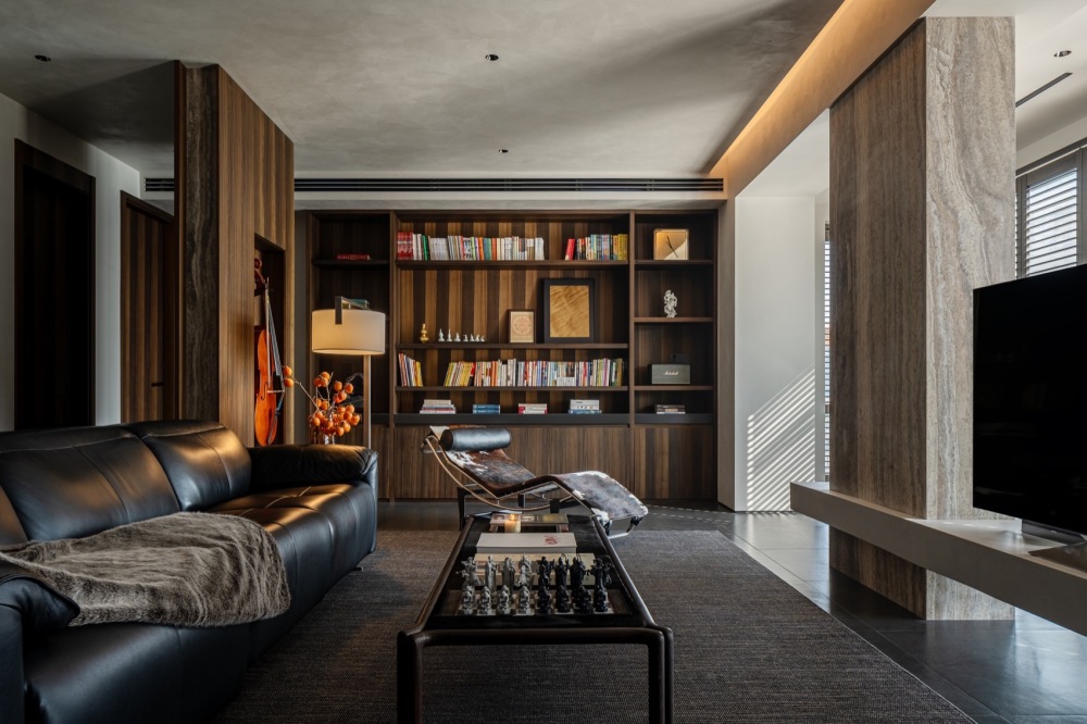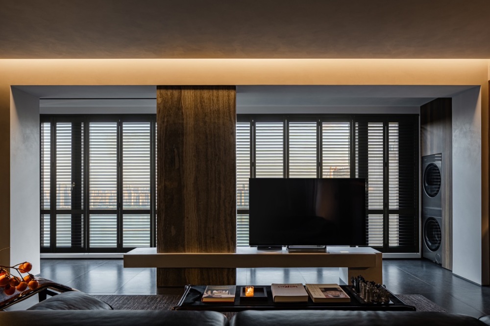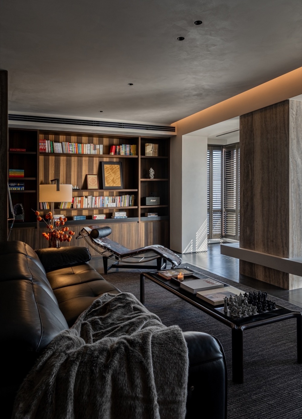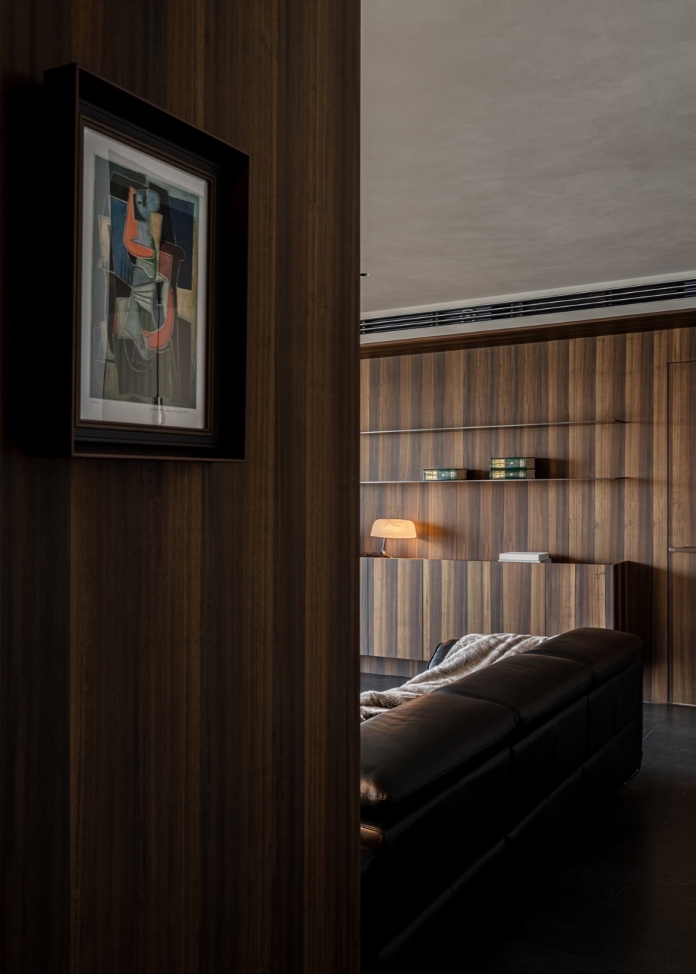 原始户型客厅与书房之间的承重墙体成了客厅空间的核心载体,我们现浇了水泥层板用来放置观影设备,水泥层合板与原始承重墙彼此咬合,烟熏尤加利木皮和银灰洞石相得益彰。专属定制的乌木色百叶窗让空间增添了许多贵气,更有一种跨越时间的冷静美感,同时因为百叶窗的运用,光线更是被精准地控制着进入室内的比例,光影与氛围被完美地平衡。