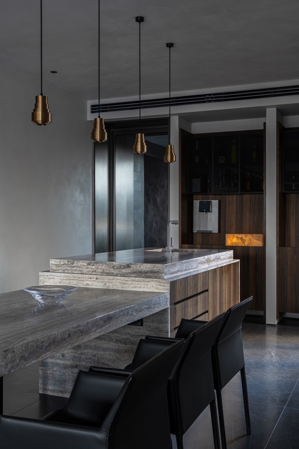 餐厅的岛台和餐桌均由银灰天然洞石制作而成,几个盒体组成的结构有秩序地组合在一起,形成一尊大型的家具雕塑餐厅的岛台和餐桌均由银灰天然洞石制作而成,几个盒体组成的结构有秩序地组合在一起,形成一尊大型的家具雕塑。