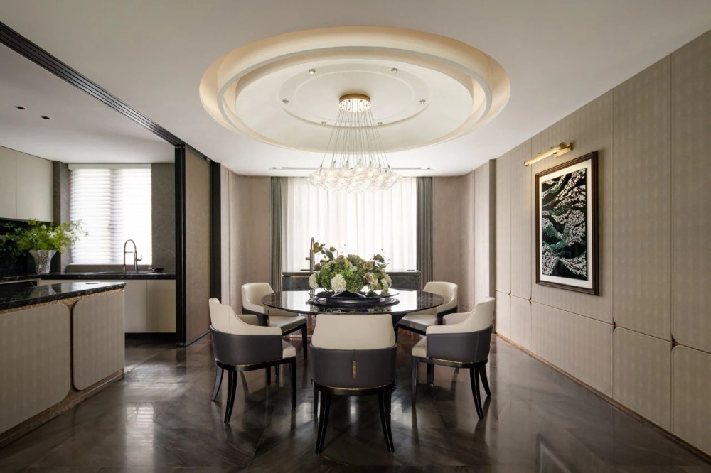 与客厅联通,餐厅内的天花板做了圆弧造型,增添空间层次,螺钿装饰画的线条描绘出山海的浪漫景象,意境悠远深长。
