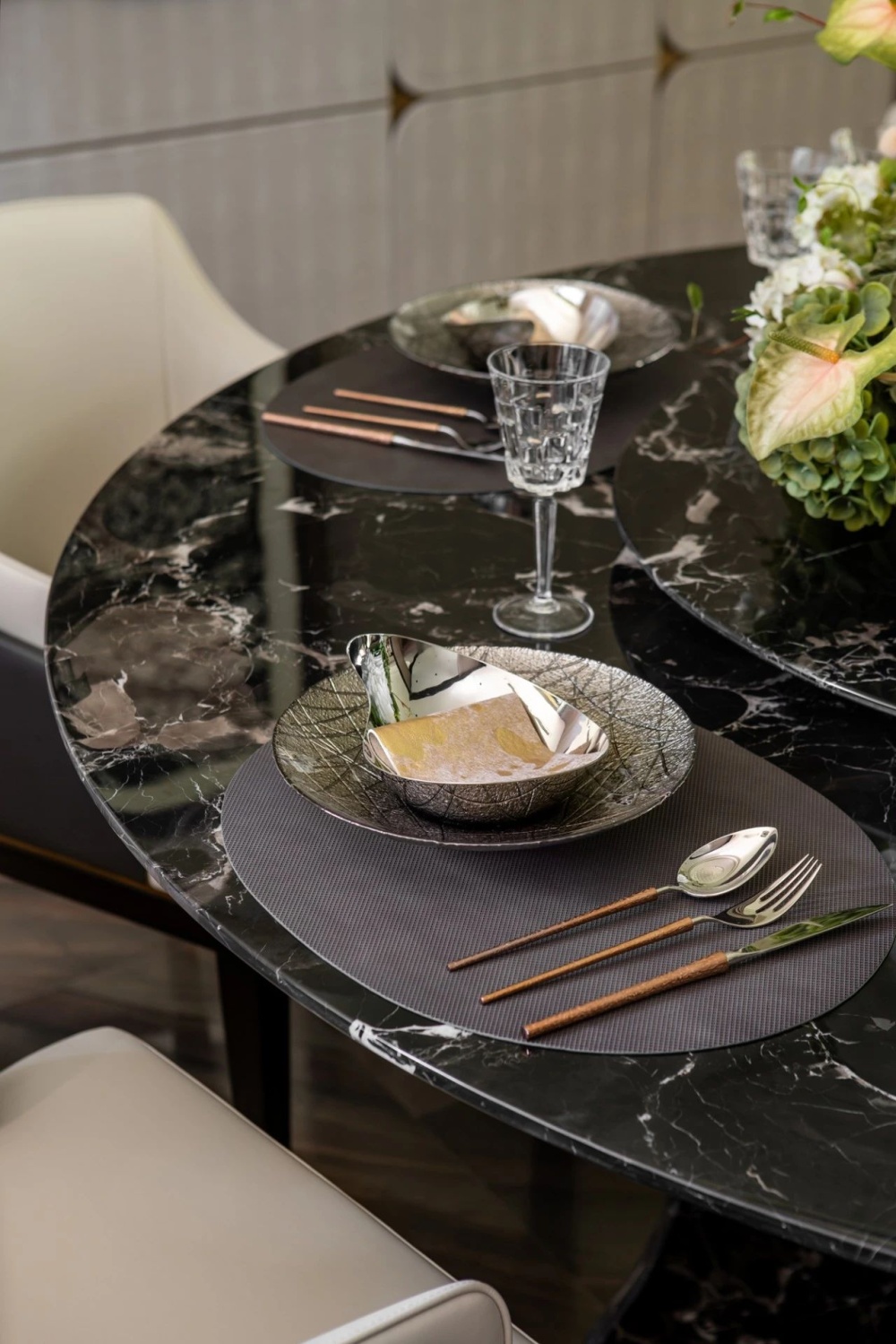 宽阔的横厅是家庭成员的生活核心区域,承载了社交聚会、家人陪伴等功能。以清冷调的大理石材质搭配主调黑白的沙发和座椅,构造出优雅简约的奢华格调。