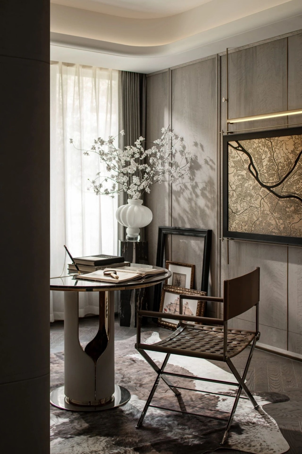 书房藏着一室清欢,角落里的净白的瓷器与花朵相映成趣,让室内多了一丝东方格调,时间在这里不是直线,而是缓缓漫开的涟漪,静谧怡人。