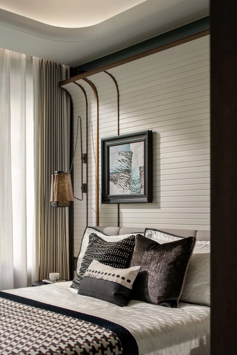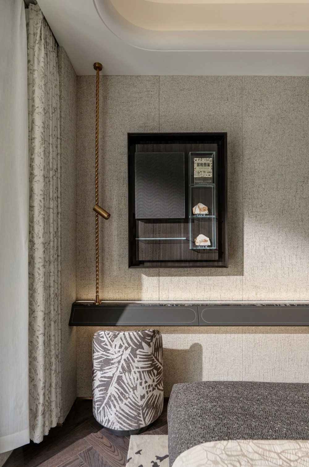 酒店式套房奢享私人天地,左右不同的灯具修饰生活的精致感,让光以最温柔的形式流淌。设置一处精神角落,诠释精致与自由的平衡艺术。