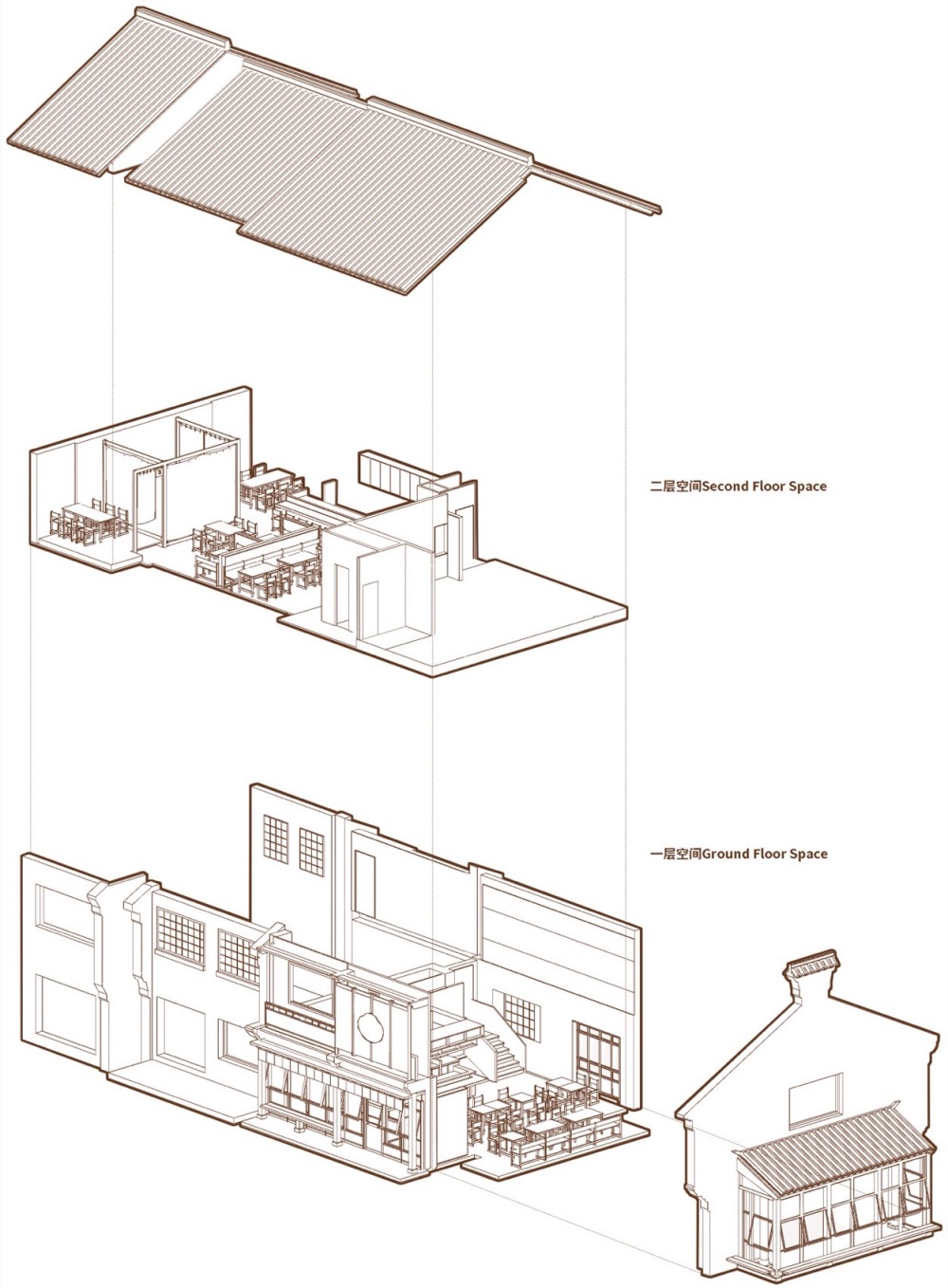 建筑外立面采用人字木屋顶勾勒出传统町屋的素朴轮廓,大面积落地玻璃窗却以现代建构语言打破传统边界。这种古今对话在窗框处臻至精妙——传统日式木作工艺与当代极简线条完美嵌合,形成光影流转的立体画框。