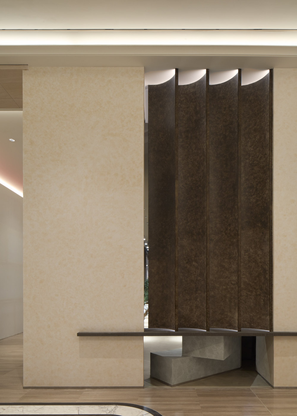 围绕树的主要座位区过渡到通往洗手间的走廊,在那里,高大的柱子和灯光效果唤起了一种深度感和森林般的氛围。在空间的中心矗立着一棵中央树,代表着清晰和目的。游客沿着窗户边的座位继续前进,这是为轻松的交谈和反思而设计的。
