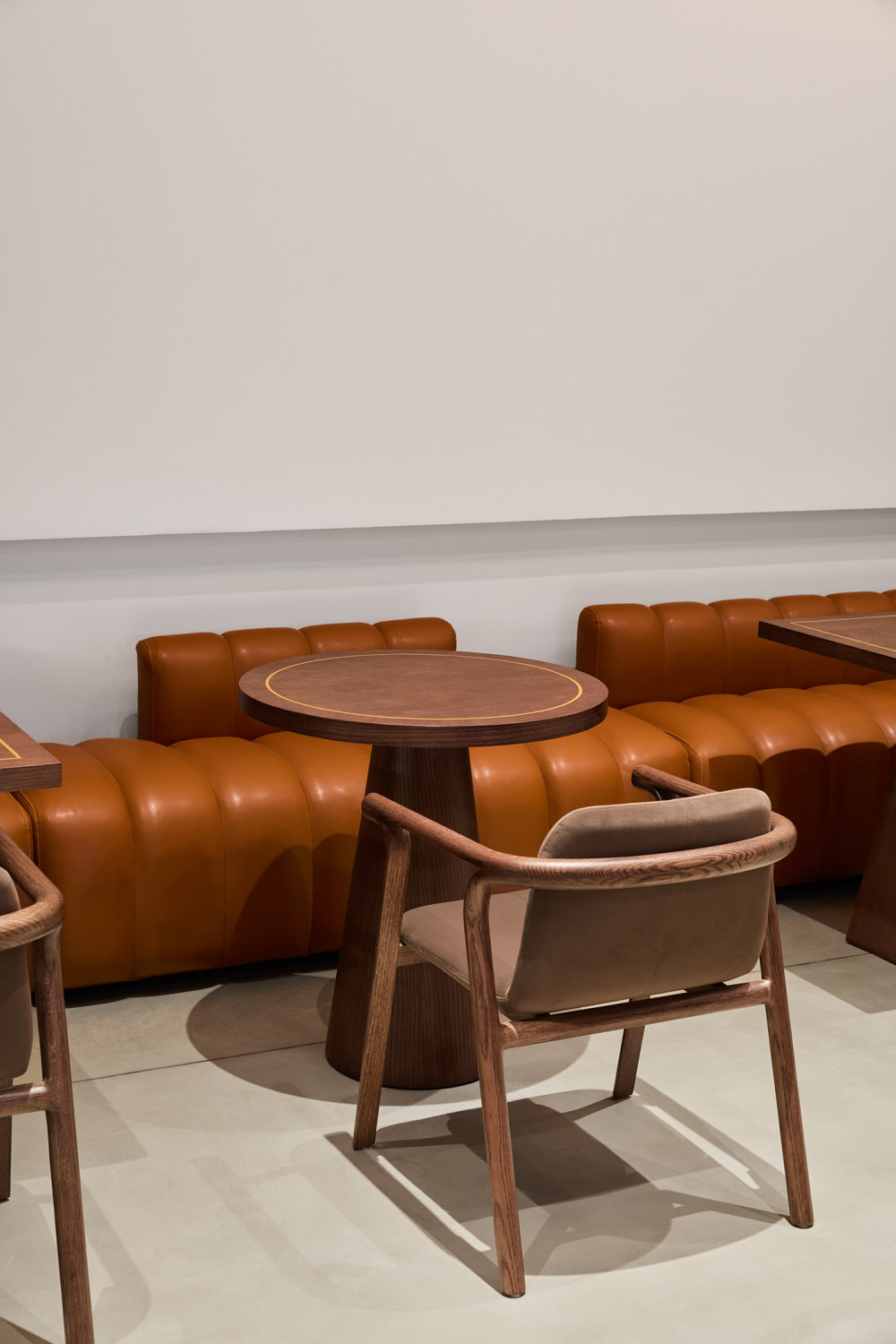 材料经过精心挑选,以强调旅程的主题:手工涂抹的灰色石膏象征着每一步的不完美。座位区的浅色木材增加了温暖感,而深色木材则定义了长时间对话的空间。外卖区以丰富的棕色色调为风格,突出了停车的简短性质。