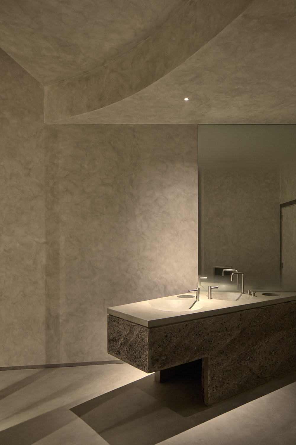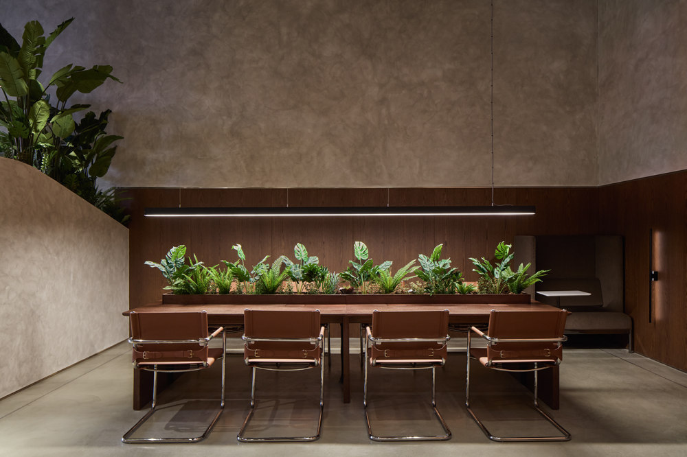 细长的矩形布局被分成沿中轴线排列的区域。在入口的左侧,窗户旁有一个露台式的休息区,可以让客人停下来休息。在室内,温暖的户外照明模仿了自然光。