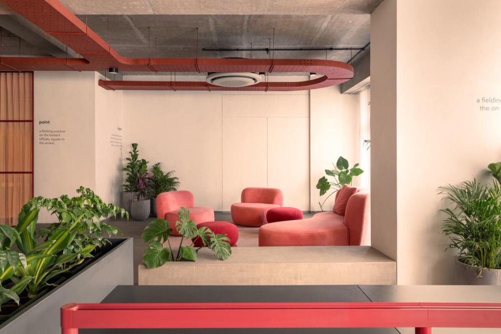 除红色之外,空间的大部分区域以舒缓的白色和泥灰色为主基调,带来视觉上的对比与平衡。多面大白墙上展示了多个板球术语的定义,不仅为空间注入身份感和趣味性,也激发员工的工作动力与灵感。此外,大量盆栽绿植点缀其间,为办公环境带来清新与舒适的气息。