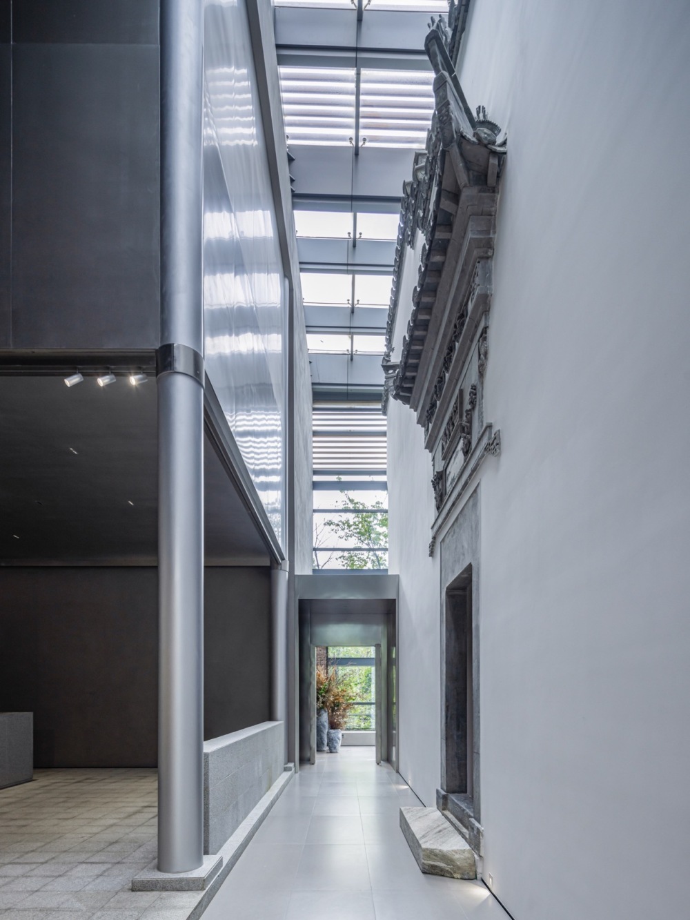 承袭东方人文历史沉淀,呈现克制的极简本质,高透光的玻璃外立面使得光线可照入室内,修复使用最简单的白漆饰面,树影投射仿佛在白墙上作画,漫反射光营造自然归真的空间。