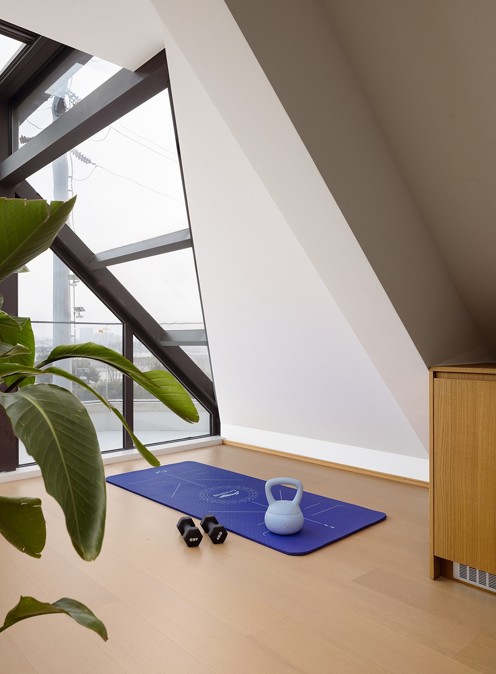 阁楼作为家庭的多功能活动室,设置了茶室、健身房。设计将露台原有斜顶矫正,天顶和墙体半围合玻璃,营造舒适的阳光房,感受生活的惬意与自然的生命力。