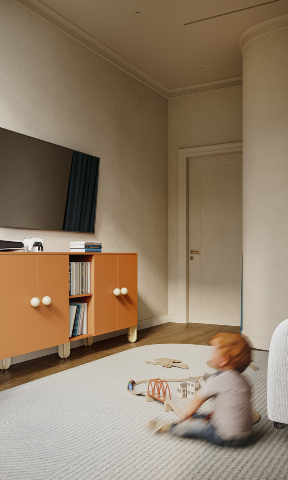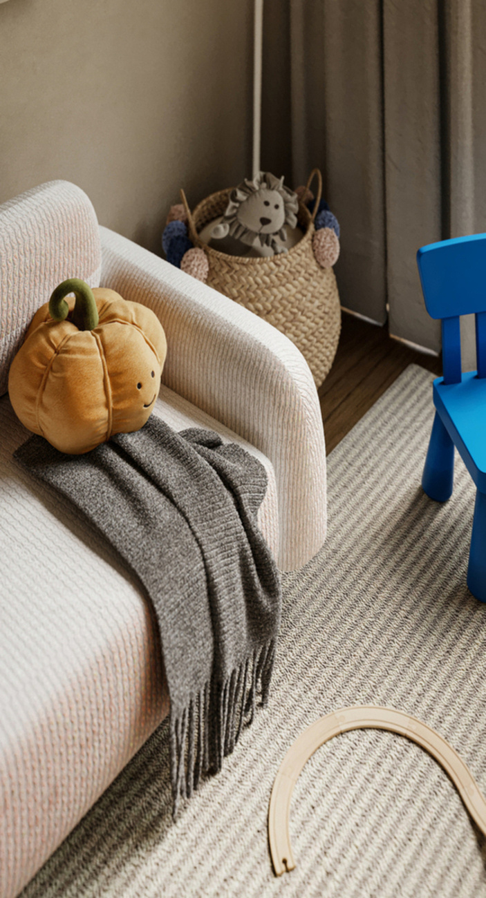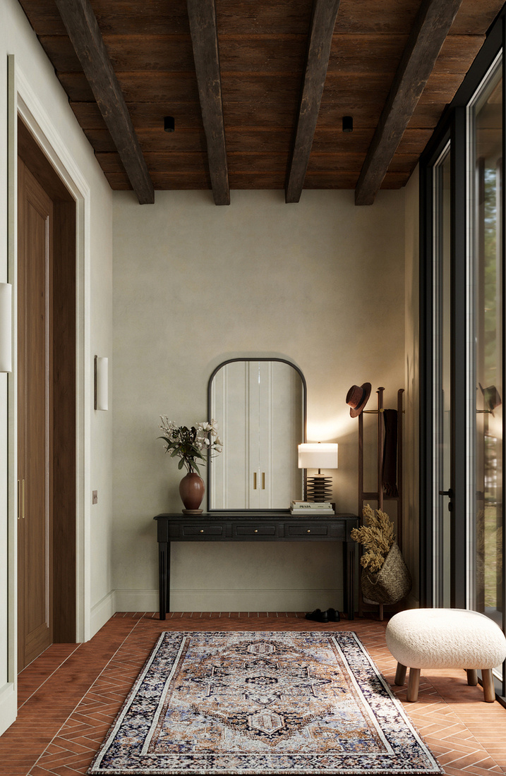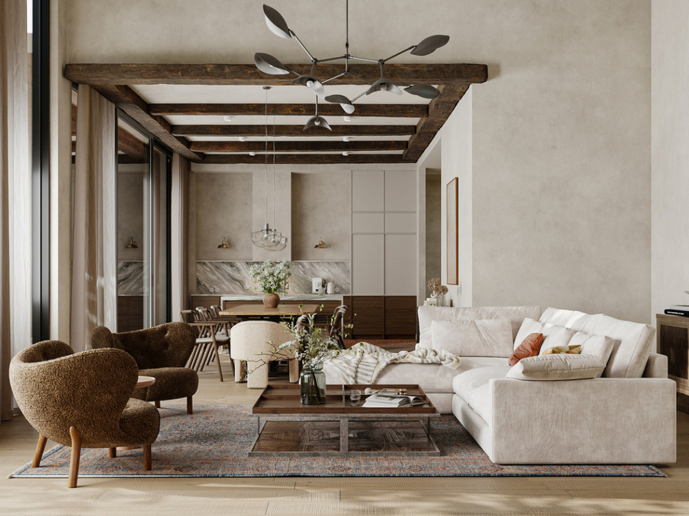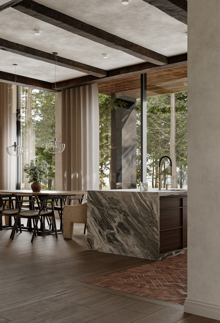 在美好生活项目中,我们设计了一个宽敞的客厅,一楼有一个厨房和用餐区,壁炉是中心元素。墙壁采用哑光石膏装饰,地板则结合了橡木拼花地板和鹅卵石瓷砖。这种搭配不仅适用于厨房工作区和走廊,还为整体空间增添了质感。为了增添民族色彩,天花板上增加了木梁。厨房没有传统的上层橱柜,以保持视觉上的轻盈外观,大理石岛作为焦点。在房子的一楼,我们设计了一间客房、一间浴室和一间家庭办公室。客房通常按照酒店套房的风格进行装饰,使其功能齐全。为了补充房子的整体室内风格,我们使用了柔软的哑光纹理。家庭办公室配备了一张来自意大利品牌LAGO的非凡办公桌。得益于其拉丝木和玻璃的结合,它使全景窗畅通无阻。上下照明可调节以适应您的心情,而落地灯和书架上的照明架为室内氛围增添了柔和的触感。