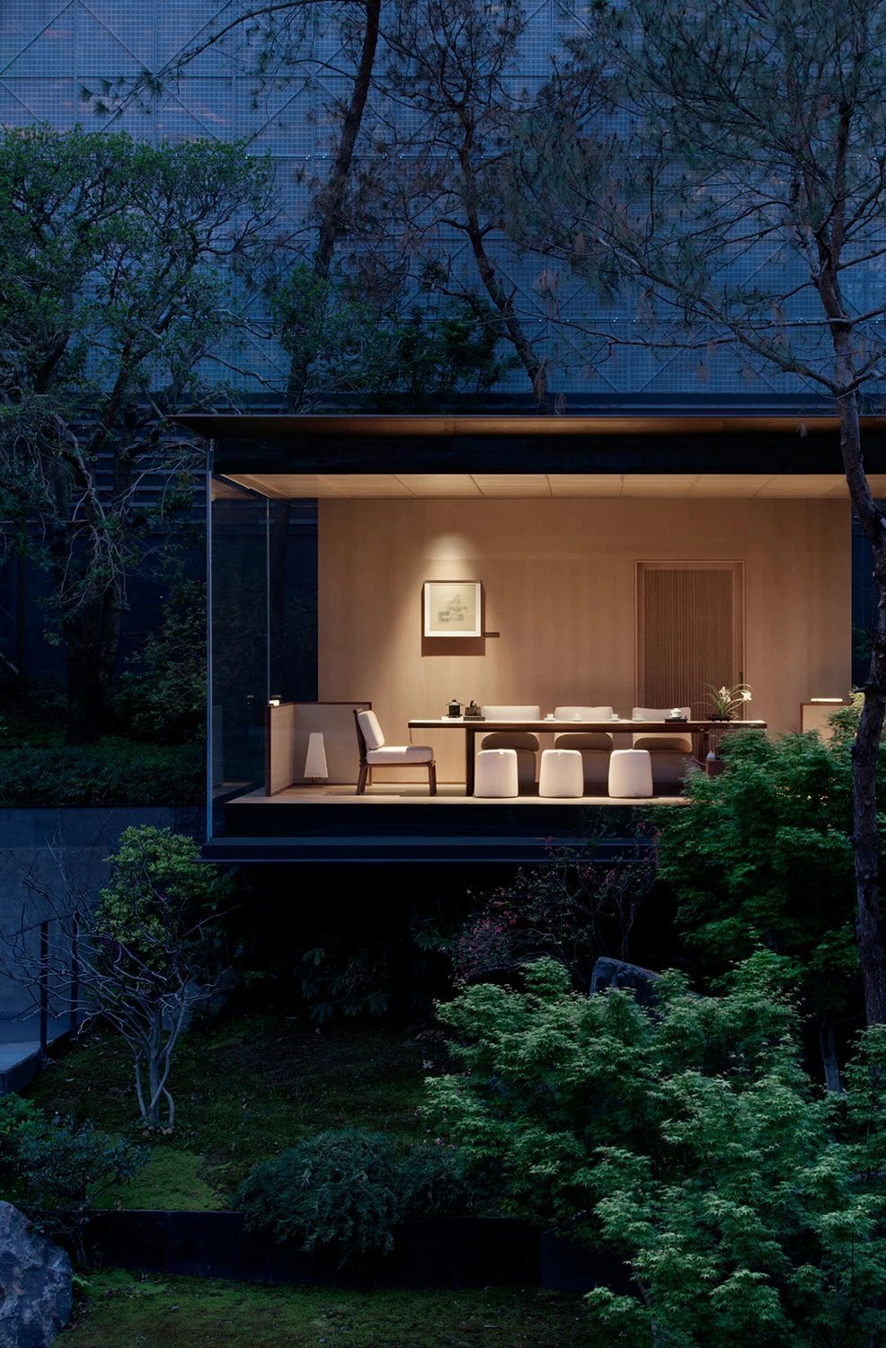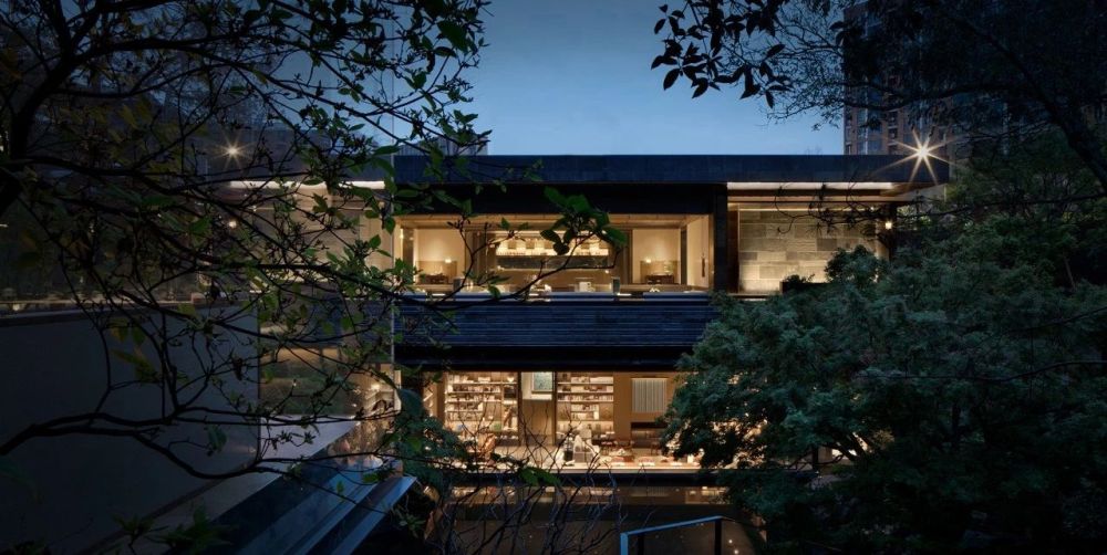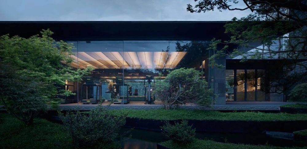 场地占地约2500平方米,建筑环抱庭院,分设上下两层,「生活馆」占据一层主要展开面,14米长、3.2米高的整面玻璃将庭院尽揽无余;「茶亭」则隐逸于自然之中,与生活馆隔空相望,互为景致。「私宴」独自辟出一方天地,在视线上与下沉庭院联动,「健身房」和「活动工坊」分置于庭院南北两侧,利用庭院的高差打造出“漂浮的瑜伽室”和“树梢上的露台”等具有差异性的空间场景。