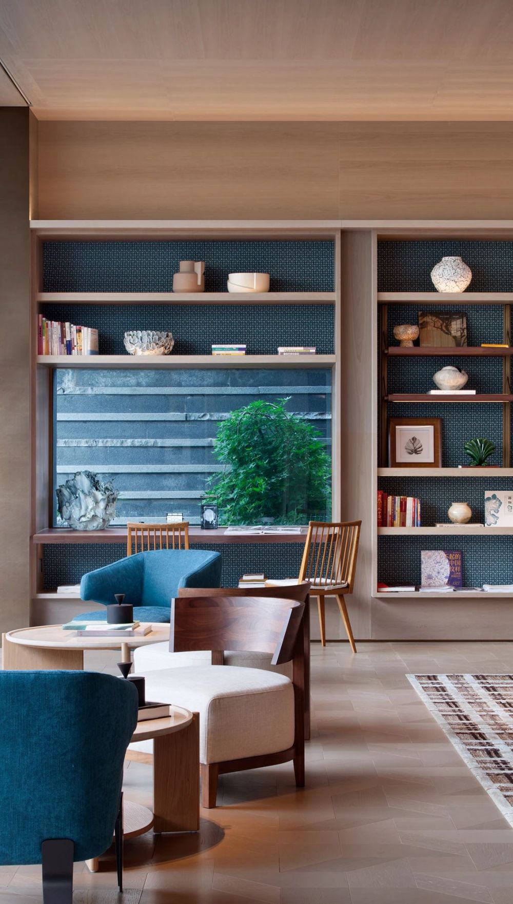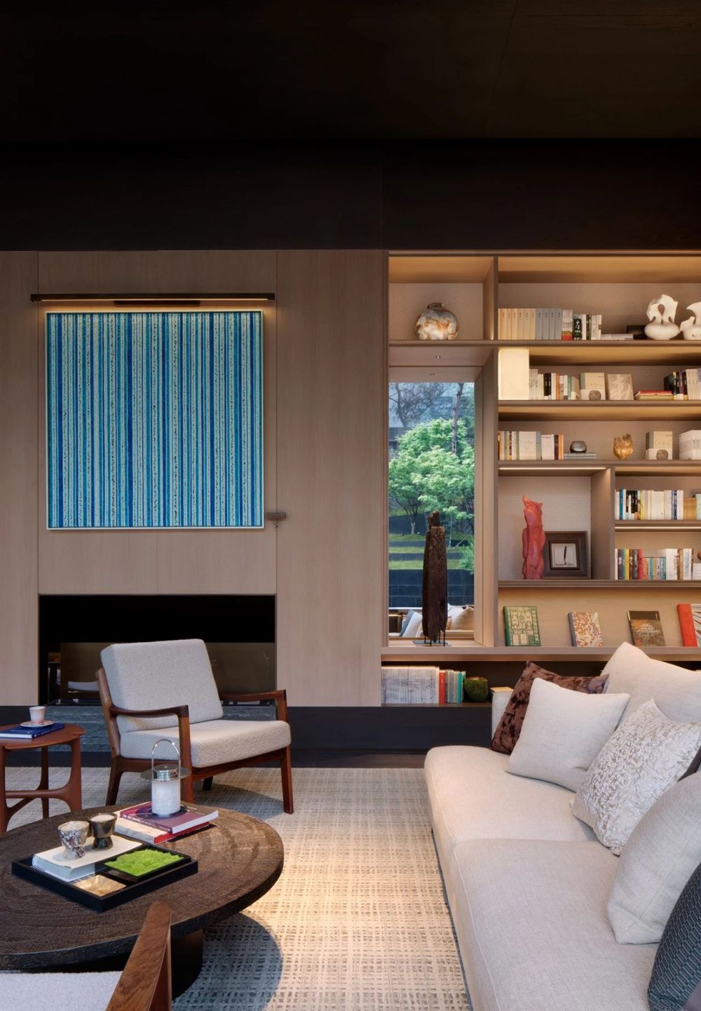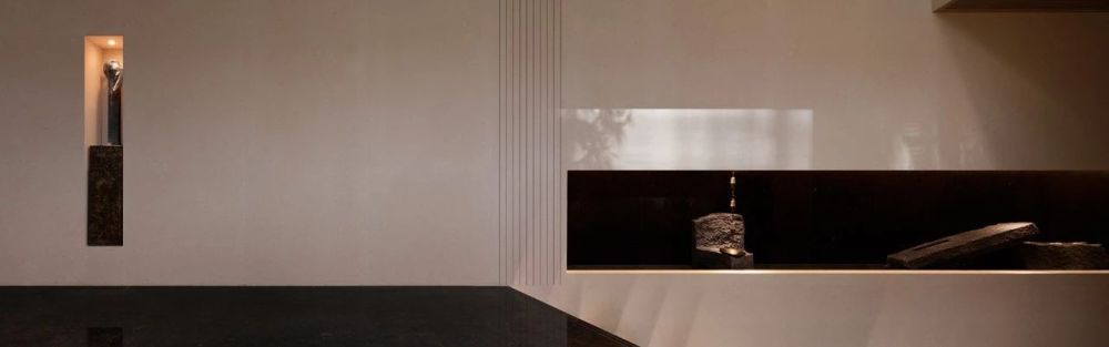 沿艺术楼梯拾级而下,抵达下层空间,各功能盒子以园林式的空间布局分置于自然之中,并用室内游廊串联。游走于廊道之中,有机的空间建构、变化的空间尺度与开阖节奏牵引着人不断探索的意趣,泳池过厅将庭院的瀑布景观引入室内;车马亭廊道的横向长窗将树影投射到墙面,与墙面的水景共同呈现自然的意向。而艺术品成为空间中的“眼睛”,雕塑、画作、装置、摄影、非遗手作等多媒介艺术作品有机置入,诠释空间的叙事性。自然、空间、艺术发生碰撞,共同营造“画中游”的沉浸体验,步履所至,转角之间,皆有景境。