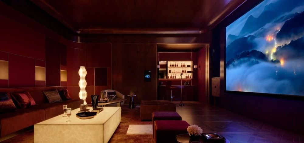 有别于外部公共廊道空间用浅色石材呈现的素雅气质,地下层功能空间内部各具风韵,每开启一扇门,便遇一方新境。「书吧」用木头营造静谧的空间氛围,人的视线自然地被引向庭院,临水而坐,一杯咖啡一本好书,沉静松驰。起身走向「棋牌室」、「影音室」和「茶吧」,空间也呈现出截然不同的性格。棋牌室和影音室选用深红色的木饰面搭配绛红壁布与云石吧台,渲染热情浓郁的空间格调;而专为女性业主打造的茶吧则用香槟色烤漆板搭配暗花壁布、陶瓷器物,勾勒柔美、雅致的空间气质。「泳池」铺设绿色马赛克和天然石材,与下沉庭院的绿意内外呼应。「网球室」同样选用绿色系的壁布,搭配红棕木饰面,演绎复古而具有绅士质感的运动场景。