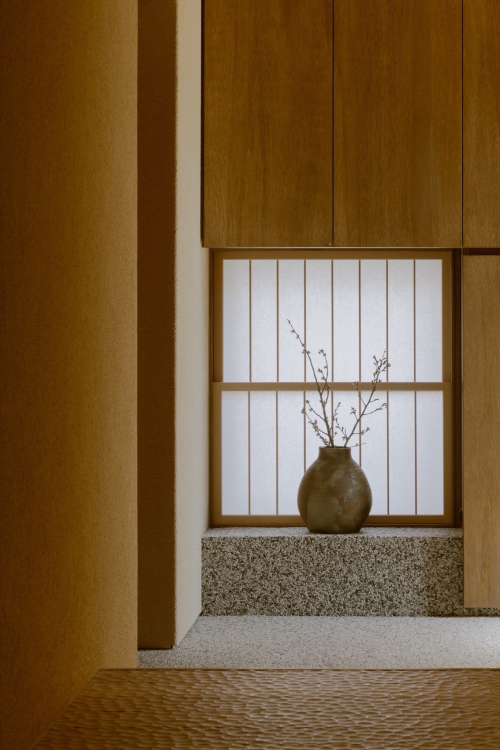 正面设置了一扇由手工精心拼贴而成的漆涂和纸门扉,并配以经过名栗加工(Naguri)的把手。以楮纸制成的和纸涂上漆后,不仅展现出独特的质感,还提升了强度,随着时间的使用更能展现出深厚的风味。