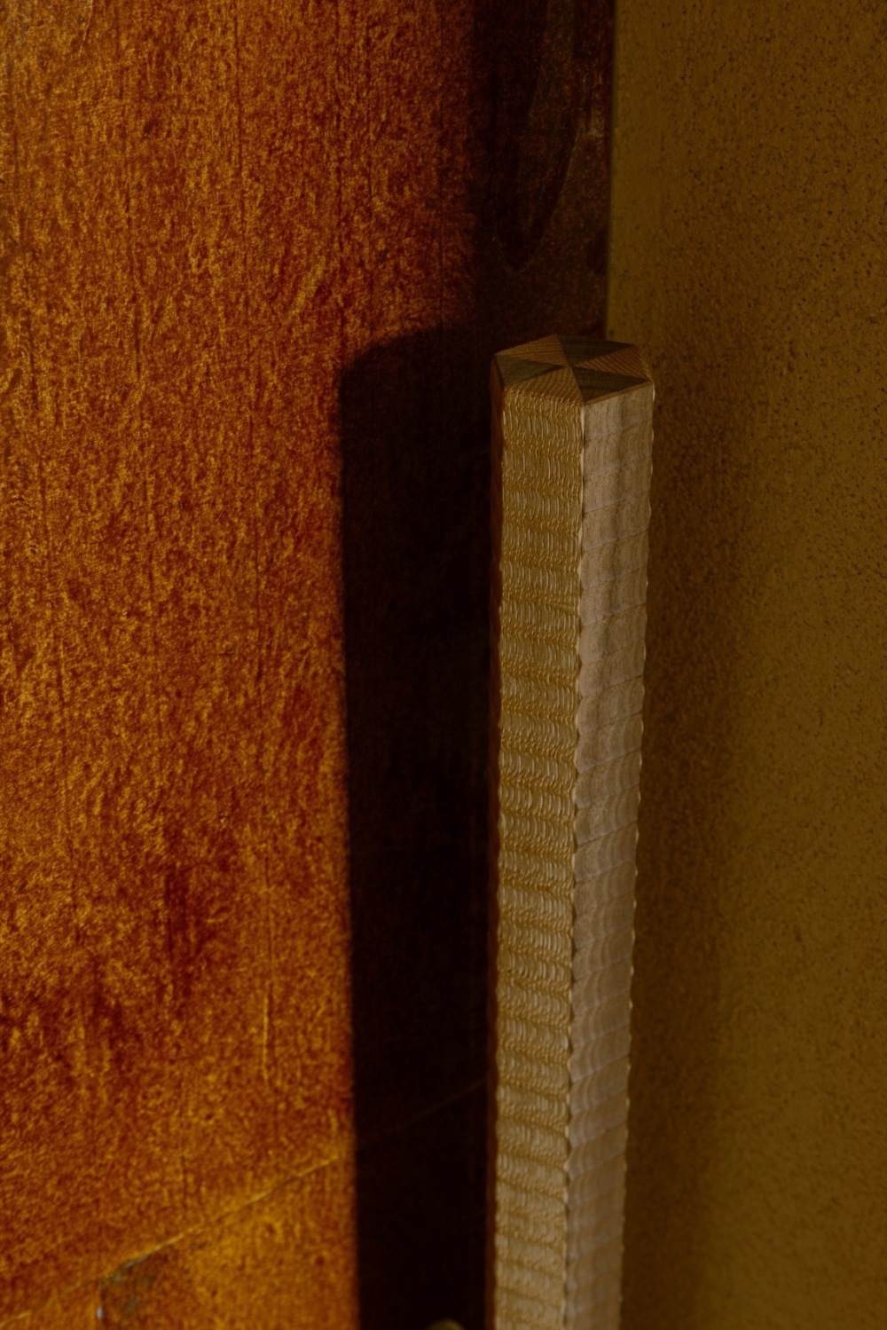 ▽贝松实木的踏板、铜色的扶手以及工匠细心缠绕的藤制扶手的质感© Keishin Horikoshi