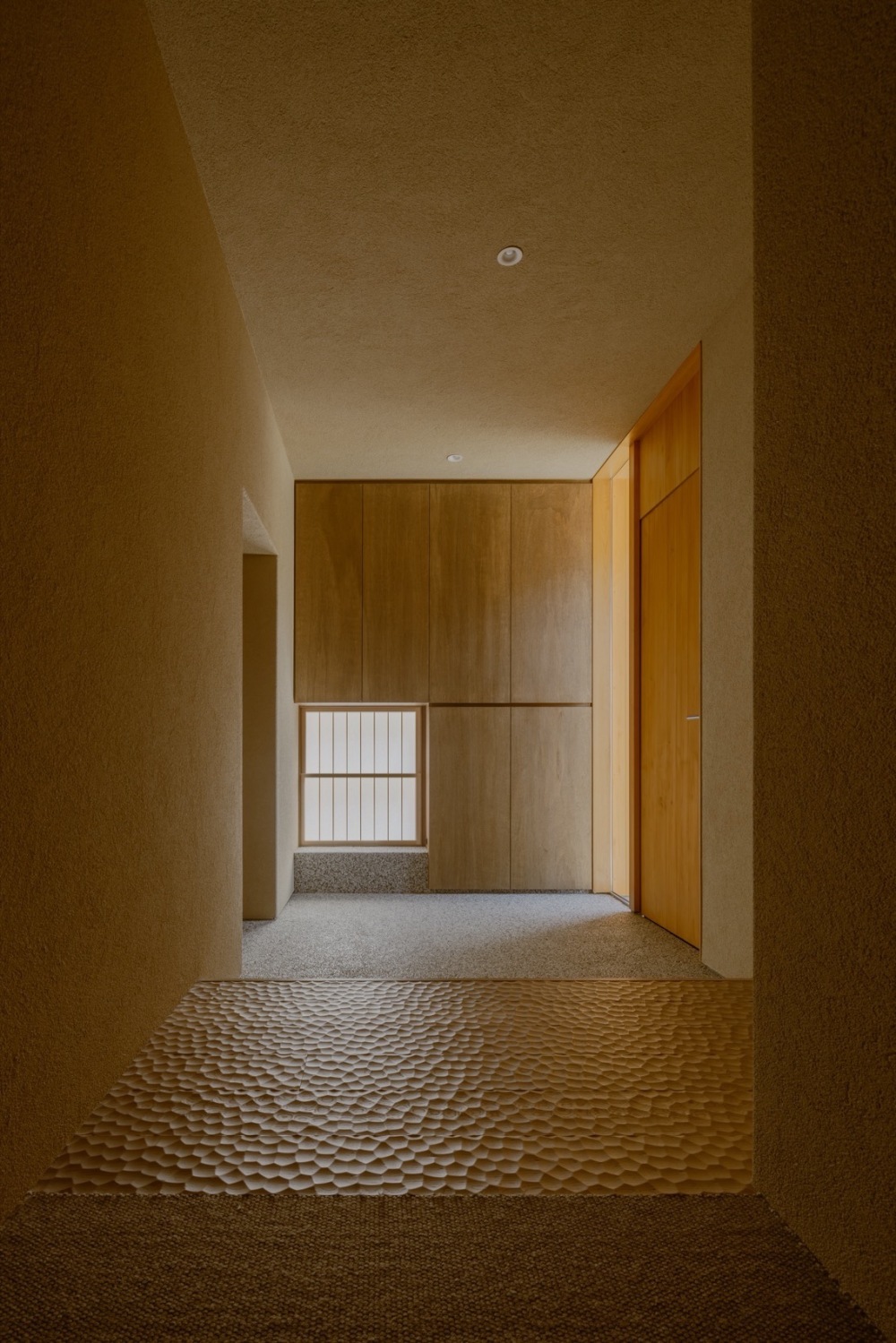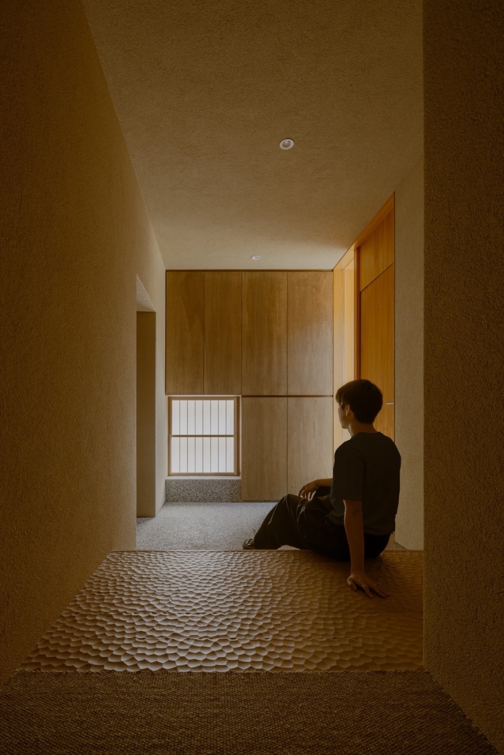 业主是一位随着日出而起、日落而眠,生活与自然紧密相连的人,因此将卧室布置在朝阳温暖照射的东侧。障子柔和地扩散晨光,质感丰富的硅藻土墙面环绕,使自然光温柔地包裹整个房间。