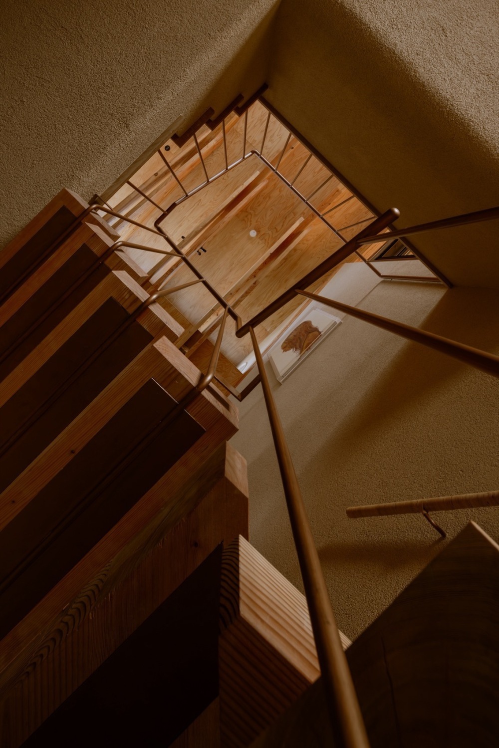 楼梯处柔和的自然光从北侧上方洒入,贝松实木的踏板、铜色的扶手以及工匠细心缠绕的藤制扶手的质感,共同营造出温馨柔和的空间氛围。
