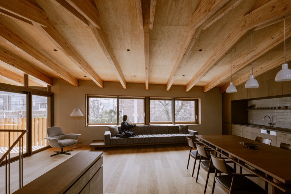 ▽客厅餐厅跨度为7.7米的木结构无柱设计© Keishin Horikoshi