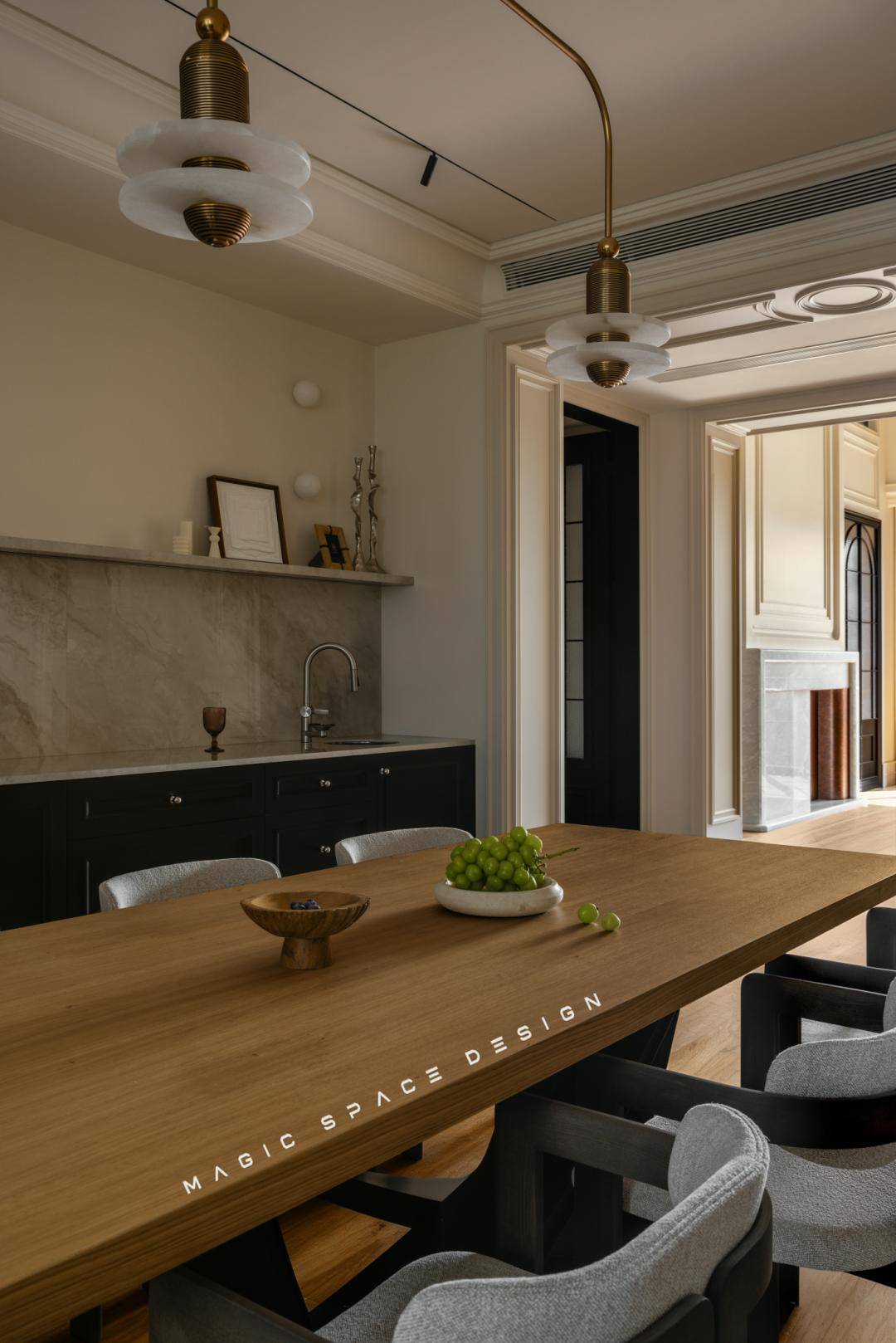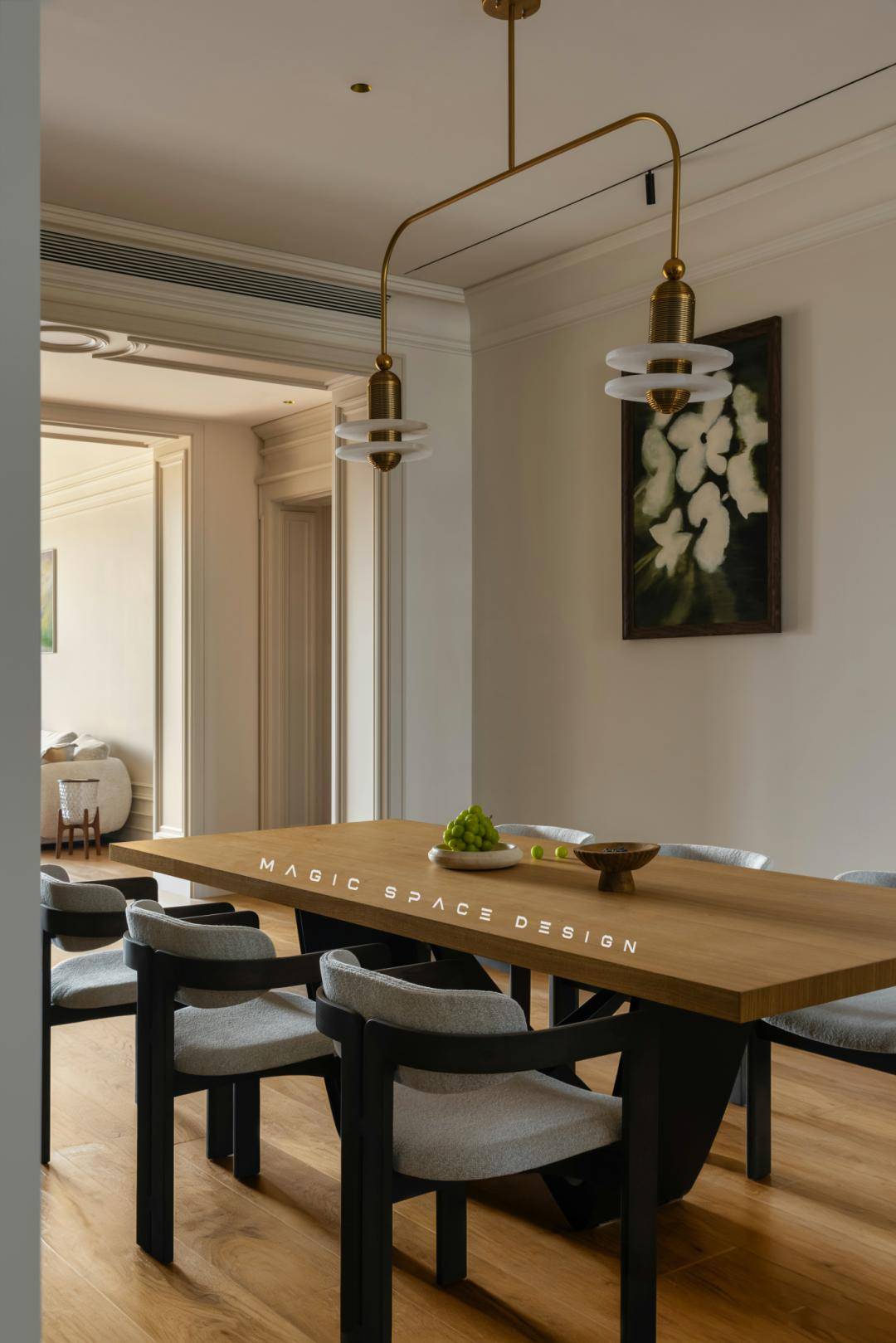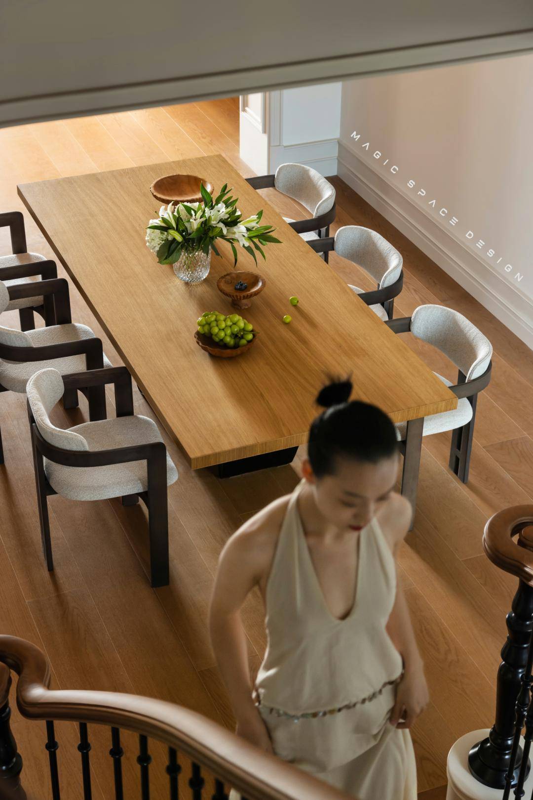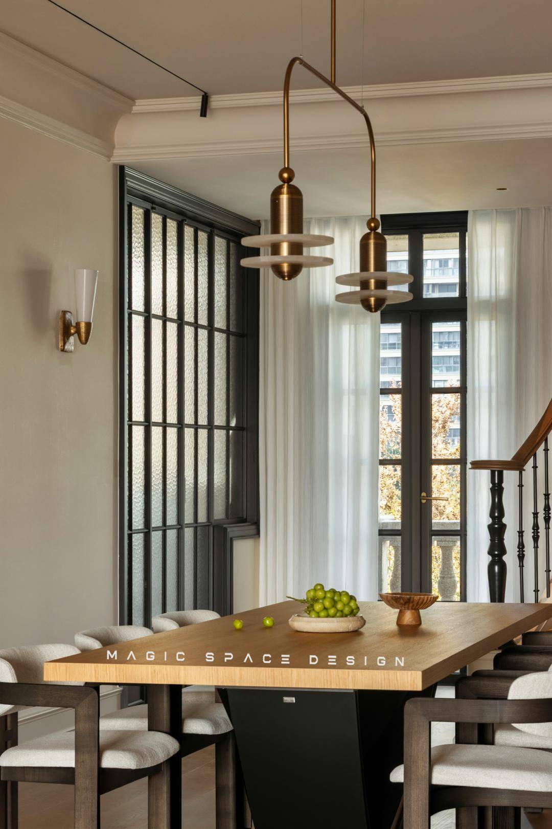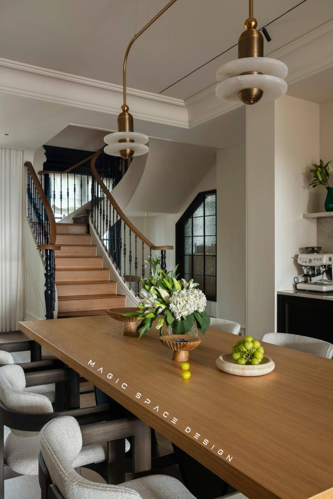 餐厅的优雅感与松弛度,由软装家具的灵动组合形成,点缀空间的往往是动人的细节。餐边柜、餐桌椅、楼梯口,动线明确、空间感承接恰到好处。功能与美学在此平衡,日常三餐仪式感攀升。