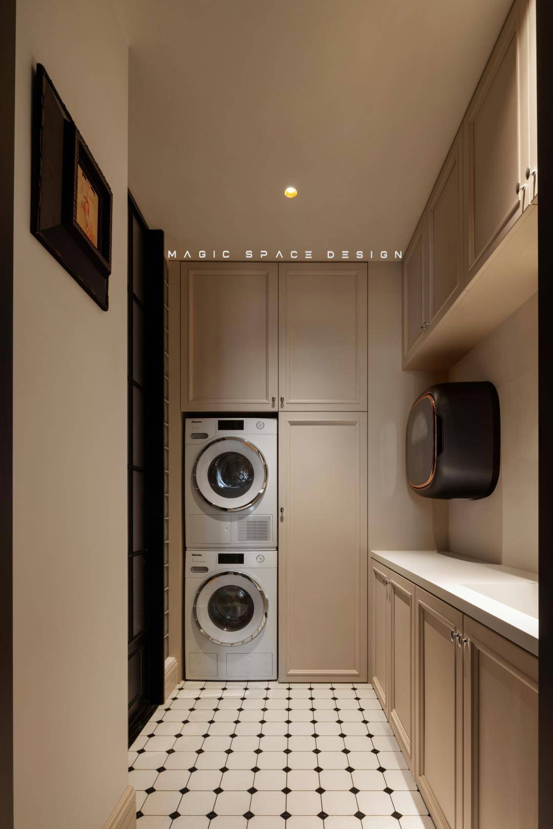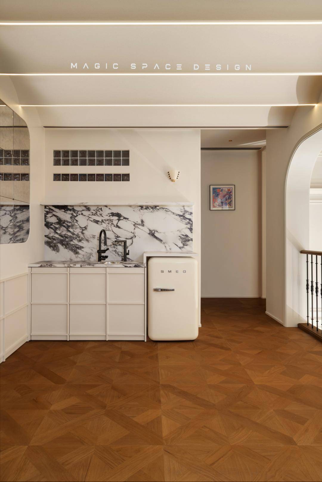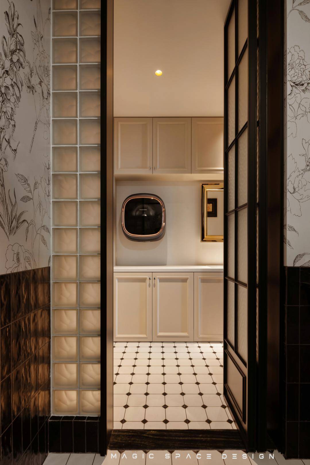 以玻璃砖隔断实现区域的分界,但是光是不被完全阻隔的,虚实朦胧之间,延续了法式的氛围,色彩简单,花砖跳脱,在满足功能的同时,维持空间一贯的明亮与轻盈感。洗衣机和烘干机被嵌入墙柜,巧妙规划了居家生活中最琐碎的功能区。